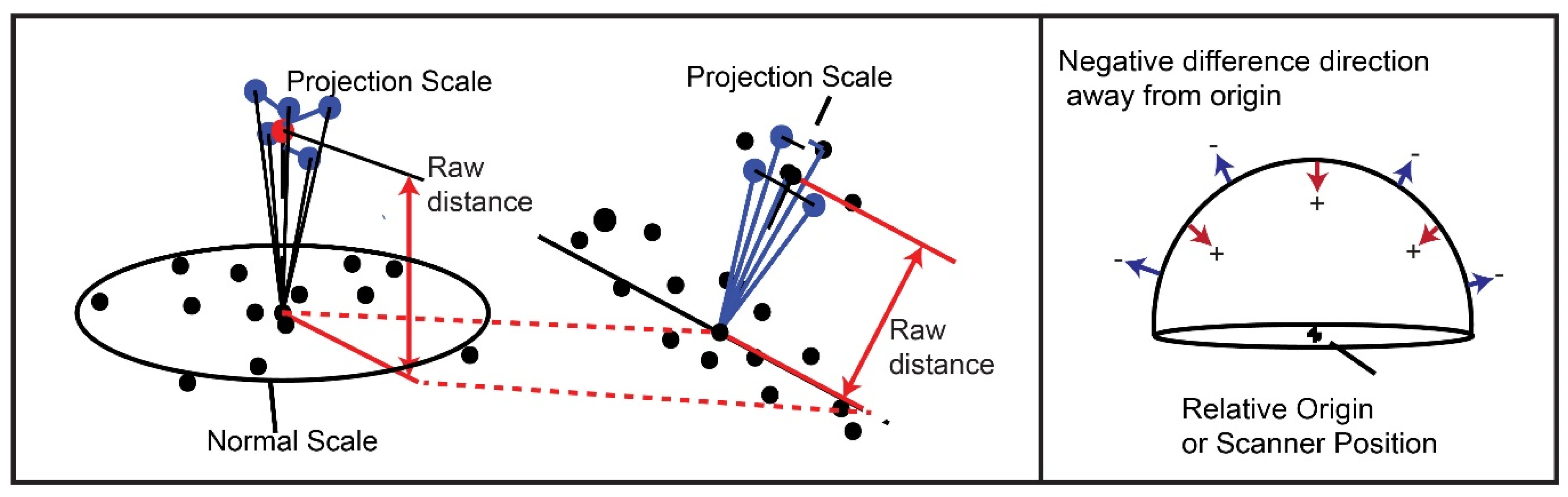 41]. This consisted of manual removal of vegetation and outlier points and application of the ICP routine to align all point clouds to the reference point cloud. The alignment residual at one standard deviation ranged from 7 to 8 mm. Distances between the reference point clouds, and each of the remaining 53 data/calibration point clouds was calculated using a normal scale of 10 m and projection scale of two times the mean point spacing (50 mm).