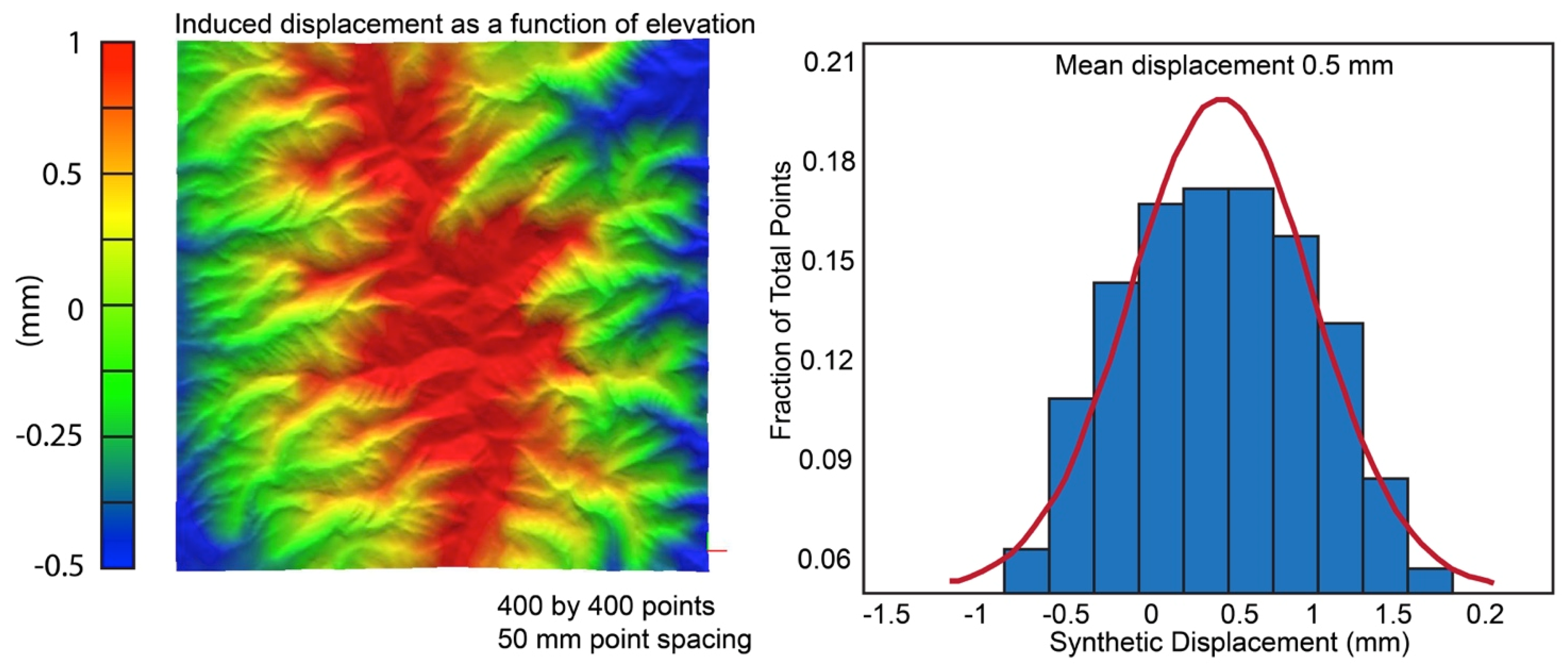 (Left) True signal, with induced synthetic change between −0.0005 m and 0.001 m on the DEM as a function of height. (Right) Distribution of induced synthetic change with mean 0.0005 m displacement.