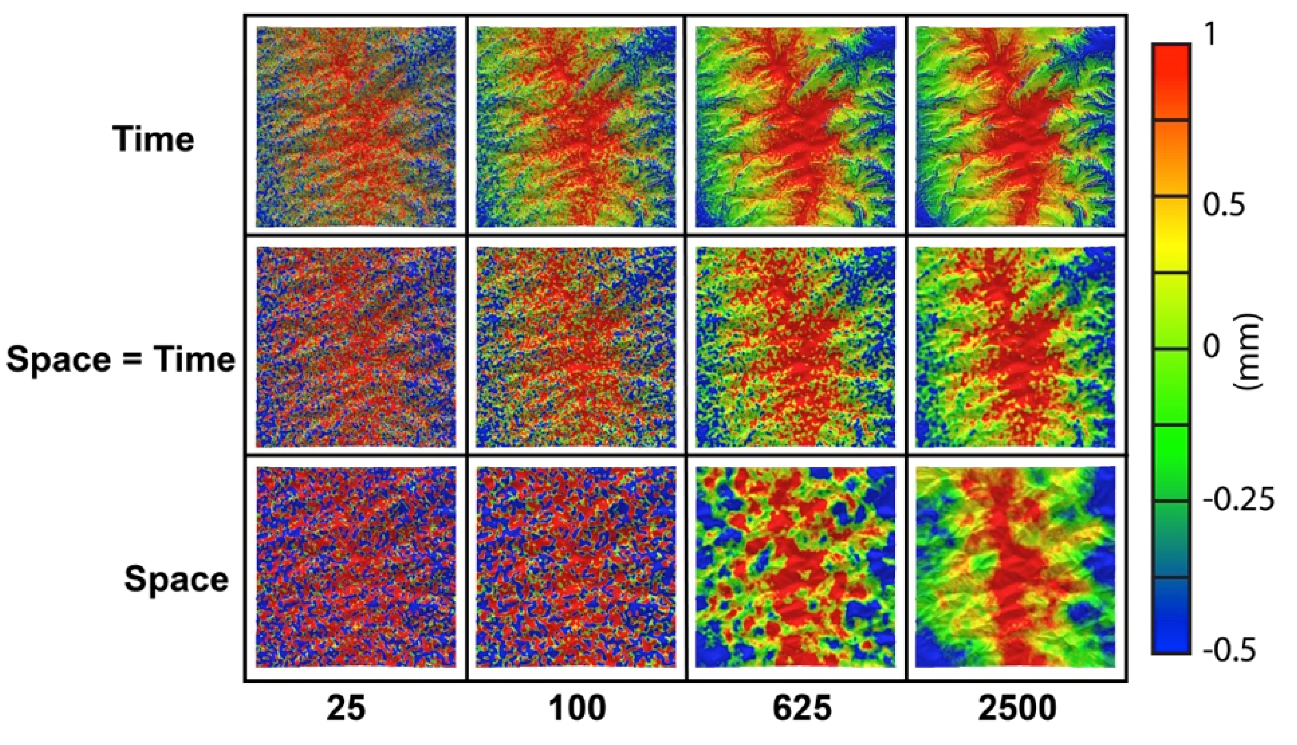 It is unlikely that a high degree of filtering in the temporal domain is practical even with high speed laser scanning. Some degree of spatial filtering can have a substantial impact on the level of detection; this is the result of the standard error reduction being proportional to the time step multiplied by the number of neighbours. The appropriate number of time steps and spatial neighbours will depend on the signal being studied, both in terms of its spatial extent and temporal rate of change, the resolution and on project constraints (time, budget, etc.).