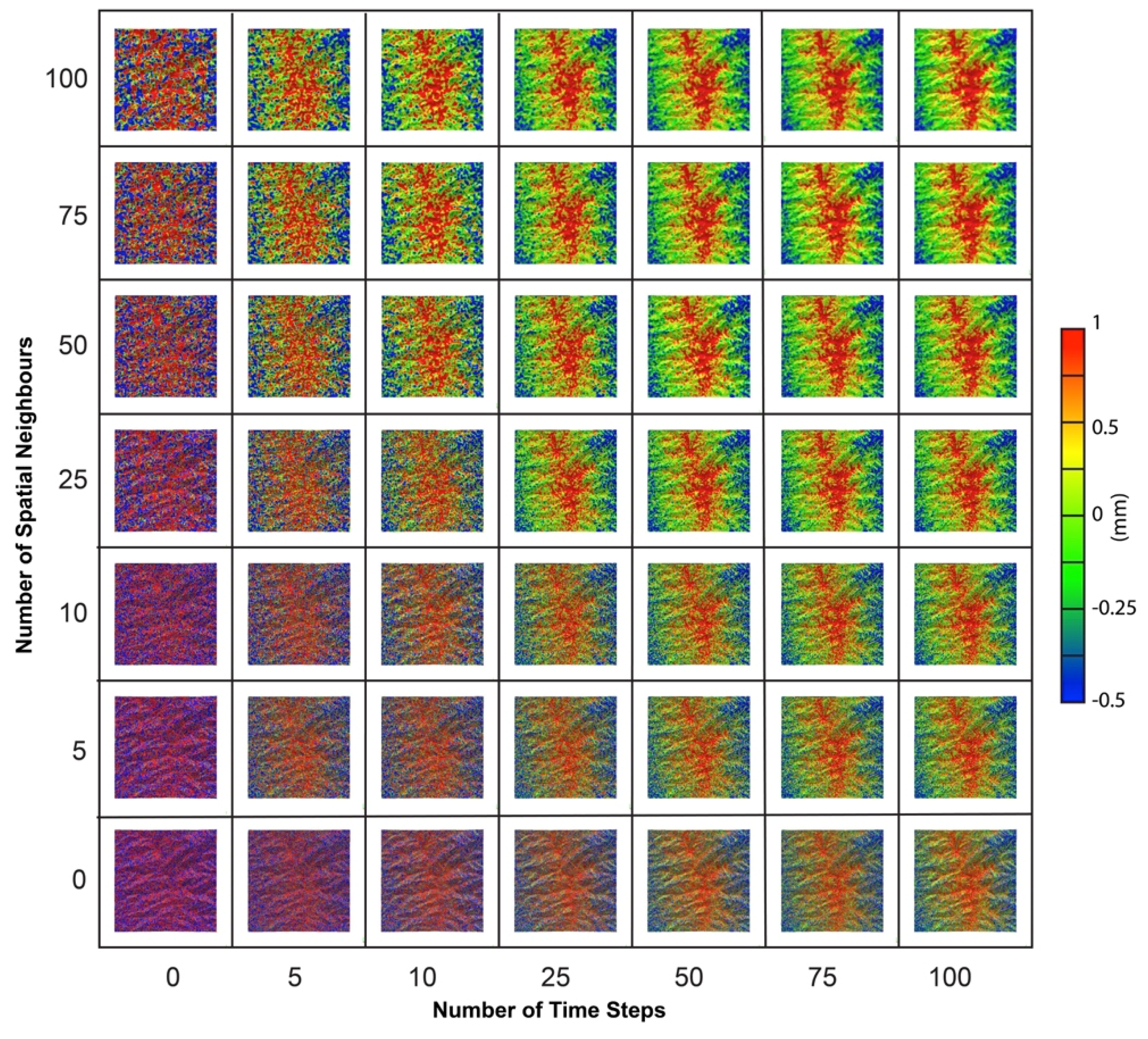 Figure 7) at a constant resolution. Every combination results in different advantages and disadvantages. Filtered results with a low number of time steps, and spatial neighbours result in an inability to resolve the true signal. A high degree of spatial neighbours and a low number of time steps result in a degree of smoothing and difficulty in resolving the signal. Conversely, a high number of time steps and a low number of spatial neighbours results in high spatial resolution of the signal, but also a high degree of noise. Ideal results are obtained from combinations of neighbours in the upper right quadrant of