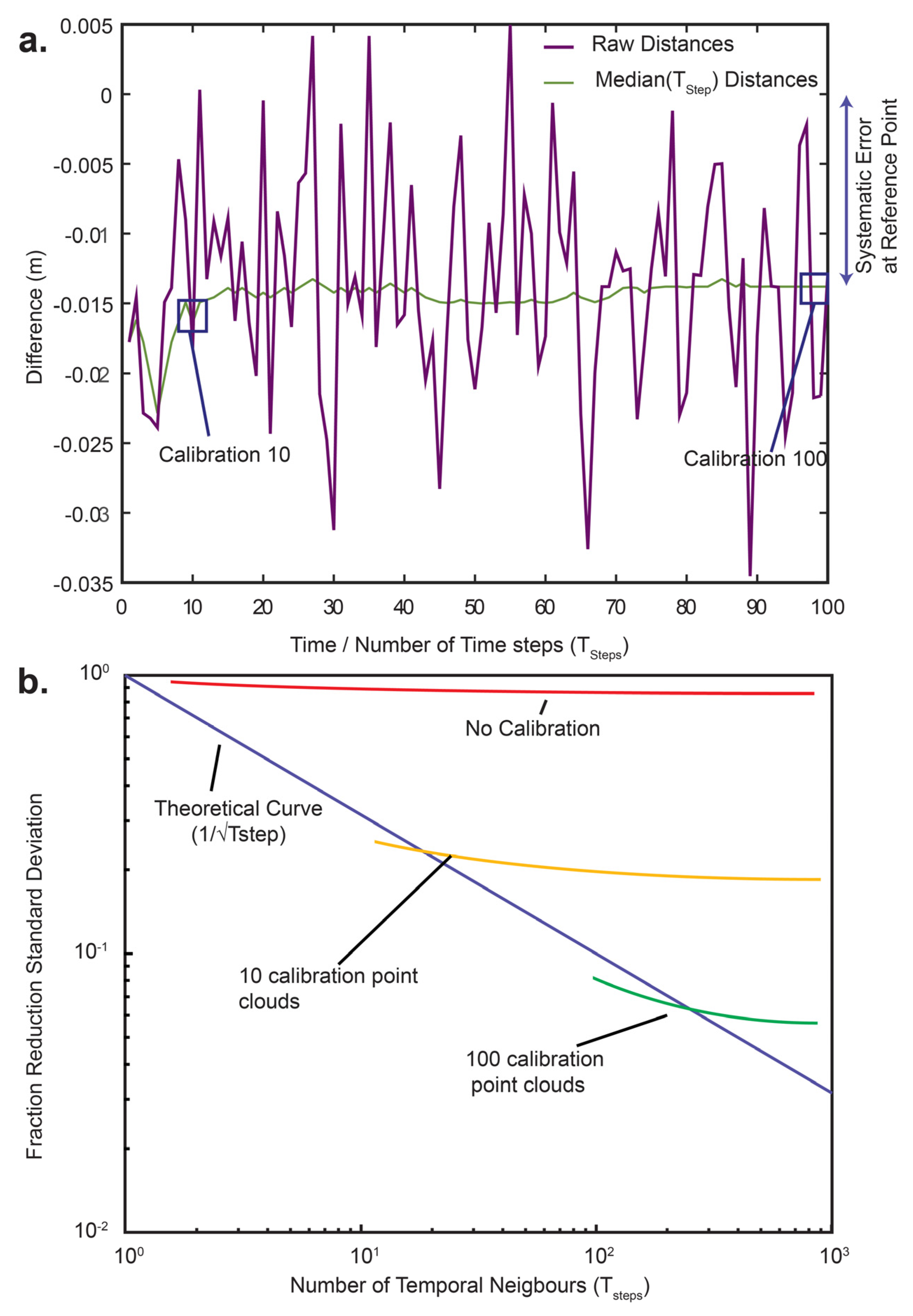 This approach reduces random noise and systematic errors. Systematic errors result from using a common noisy reference point cloud to calculate distances or from alignment error or poor incidence angle. The use of calibration point clouds allows the calculation and removal of the systematic error specific to the reference point cloud. Convergence on the systematic error usually occurs around Time Step 10. Further use of calibration point clouds slightly increases the precision of the calibration values. For this reason, a calibration point cloud number close to that of the time step used will result in the theoretical reduction in the standard deviation. The use of calibration sets can also be a useful approach for any survey design, even if scanning is not conducted on a high temporal basis. For example, the first acquisition would consist of the reference scan and a frequent collection of point clouds to be used for calibration followed by data point clouds acquired at a lower frequency. Alternative techniques to removing the systematic error caused by using a noisy reference include using alternative de-noising techniques on the reference, perhaps fitting a surface model to a densely acquired reference point cloud, or marching forward the reference point cloud through time. The latter proves to be inefficient due to an increase in computational time by a factorial factor.