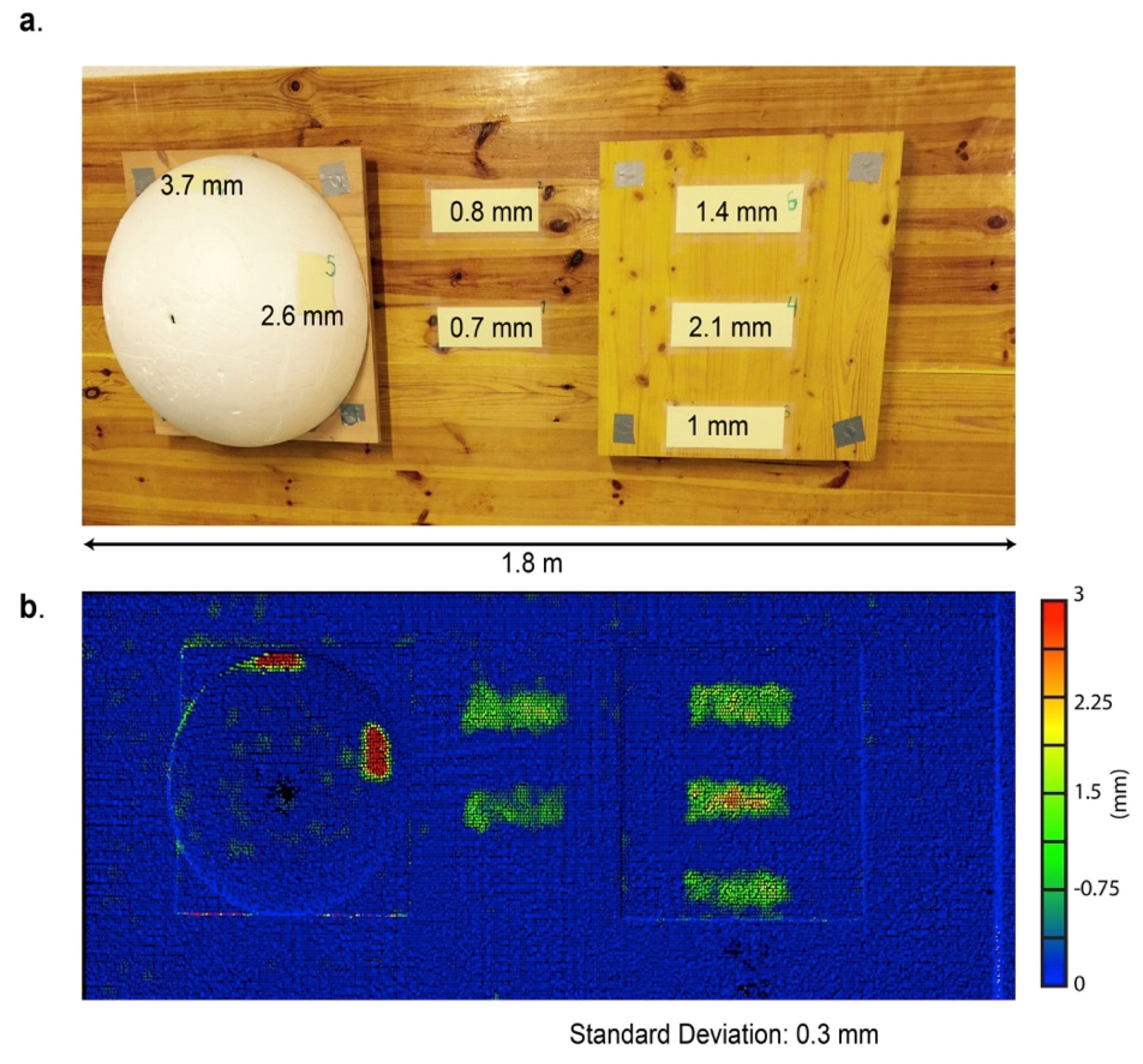 All seven areas of induced displacement were detected, and noise was reduced throughout the scene. Distances at the center point of the five areas of induced change normal to the scanner ray ranged between 0.7 mm and 2.1 mm, and distances on the half sphere were 2.6 and 3.7 mm, respectively. The measured induced displacements are generally higher than the summed thickness of the stacked cardboard at each location. This is likely due to air between the sheets of paper and between the sheet and the wood test board and/or as a result of difficulty in measuring the induced changes of this magnitude accurately with conventional measuring techniques.