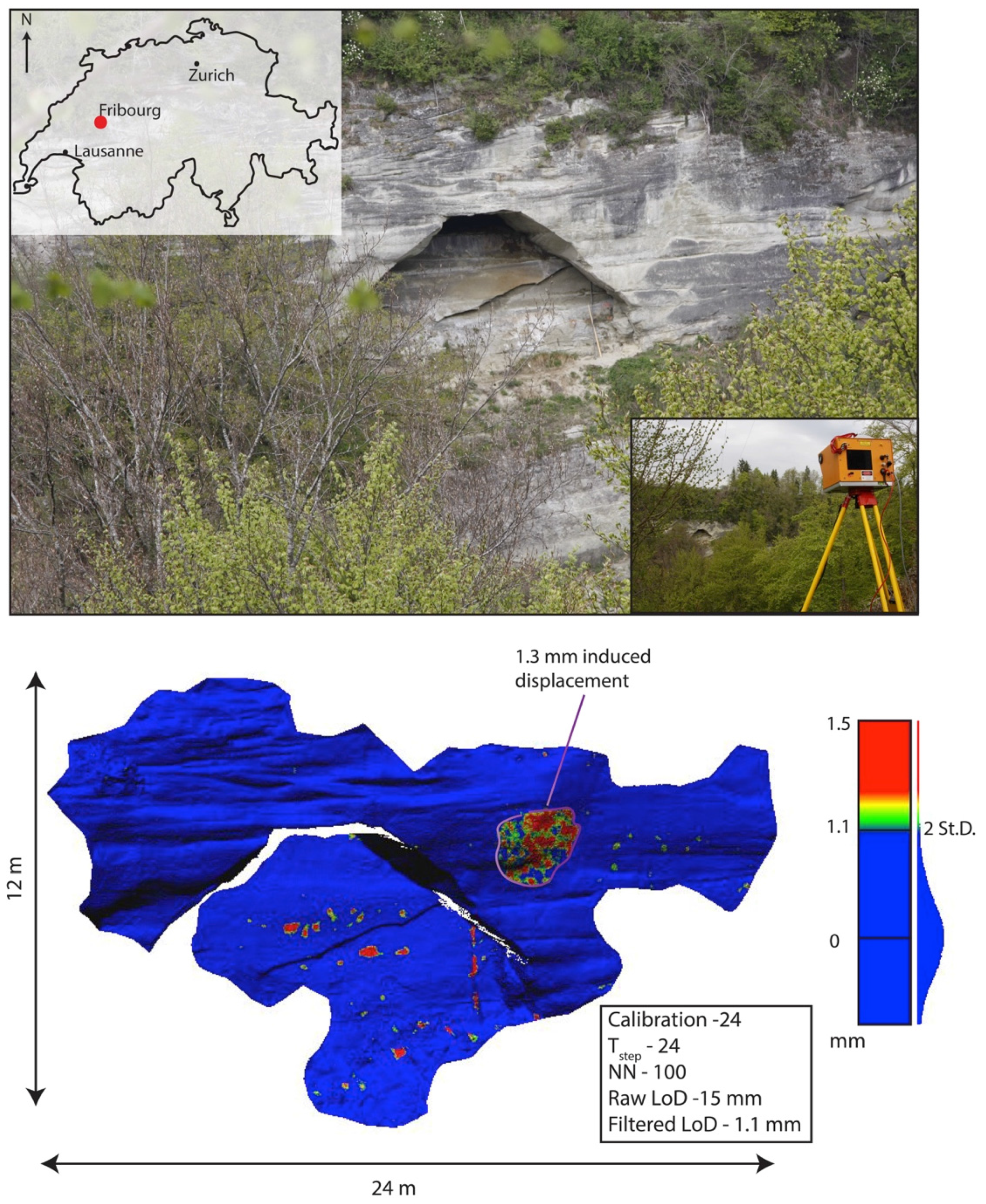 (Top) Survey setup at Le Gotteron valley near Fribourg, Switzerland. (Bottom) Filtered displacement using 24 calibration point clouds, a Tstep of 24 and 100 spatial neighbours. This resulted in an LoD of 1.1 mm and the detection of a 1.33-mm area of synthetic displacement.