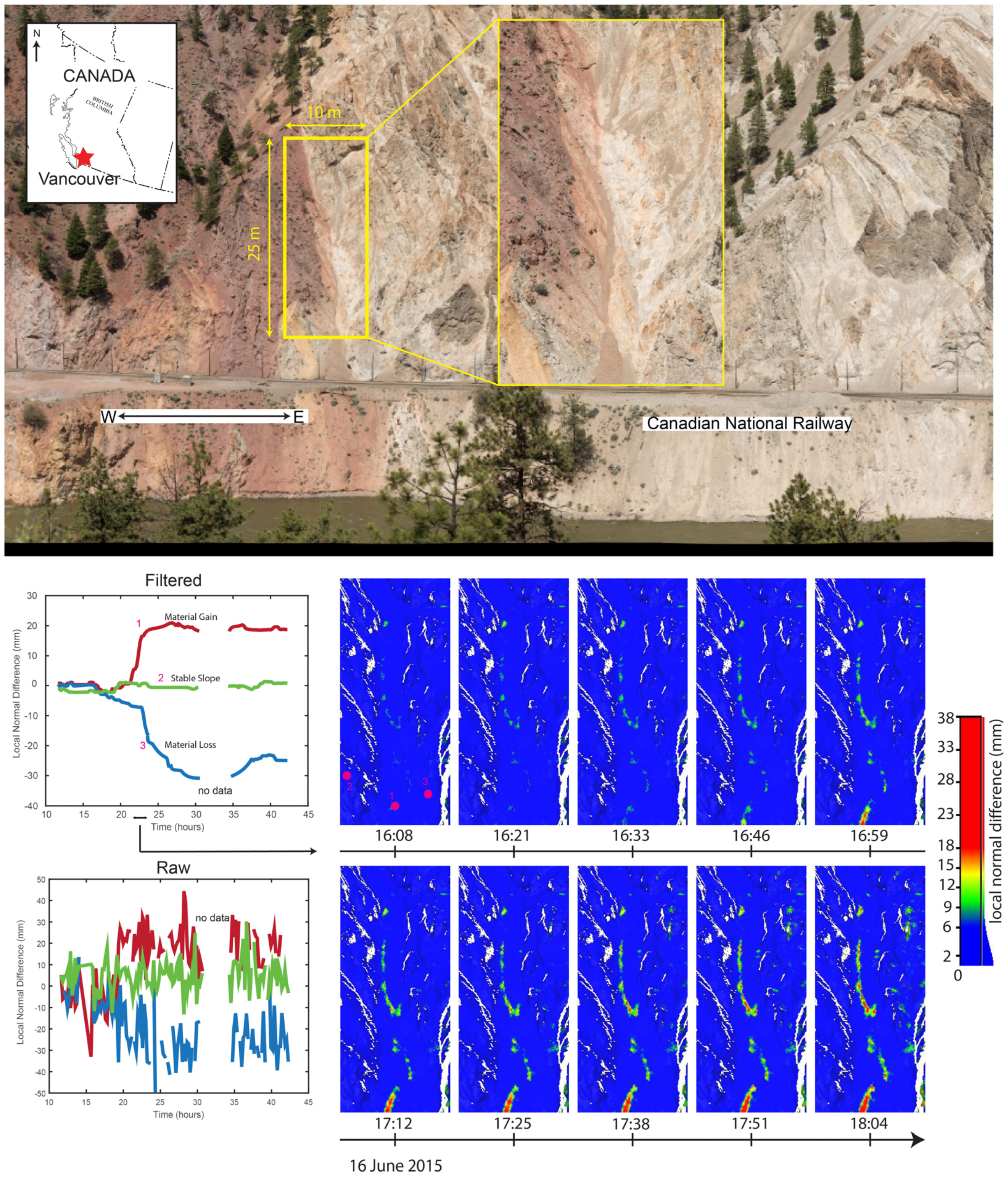 Application of the algorithm to a sediment flux study at White Canyon in western Canada (top inset). Lower left: raw and filtered displacement time series for three points, one with the accumulation of material, one with the loss of material and one of the stable slope and the same time series. Lower right: change detection map for the accumulation area of the gully for a 116-minute period where sediment flux was observed.