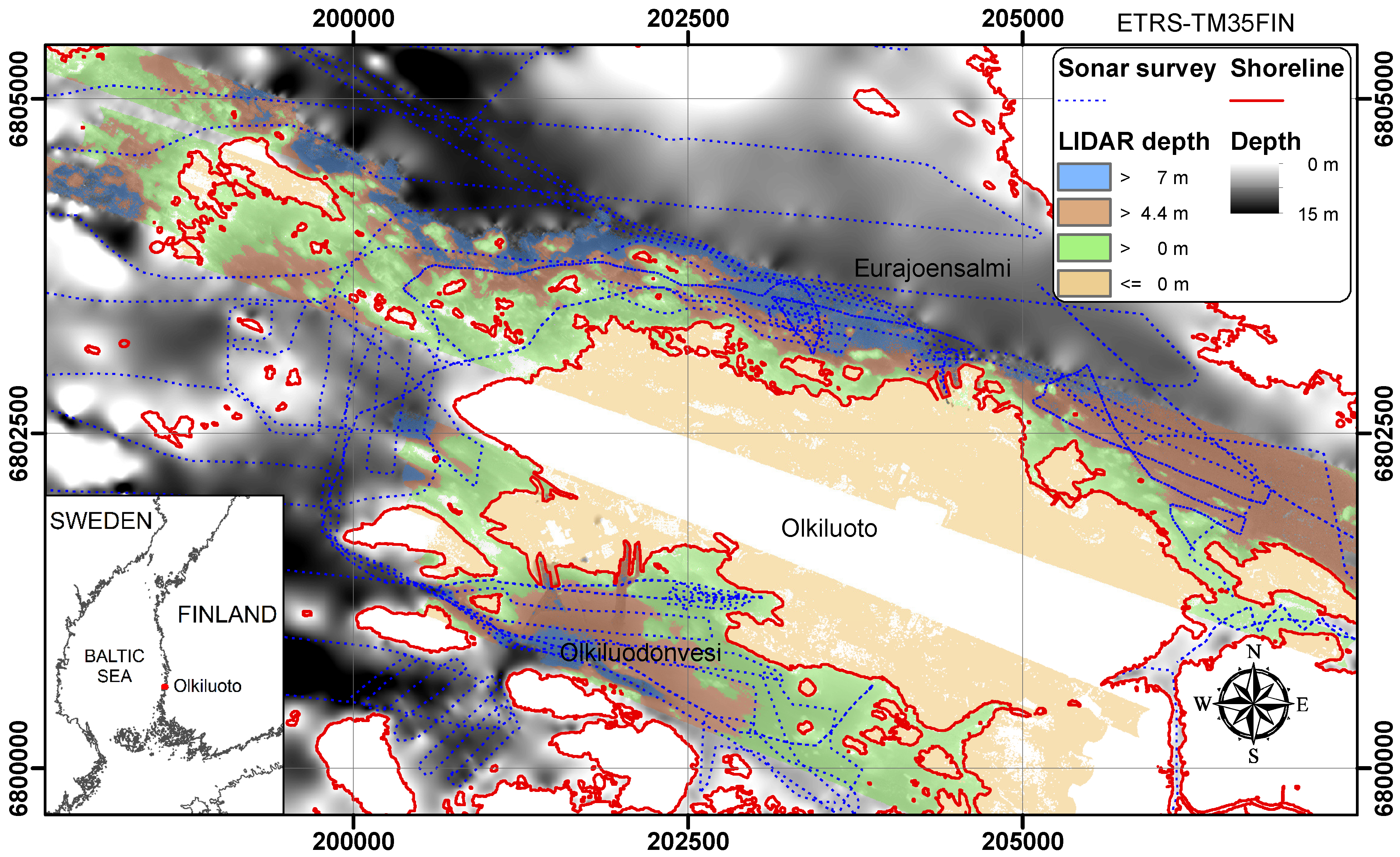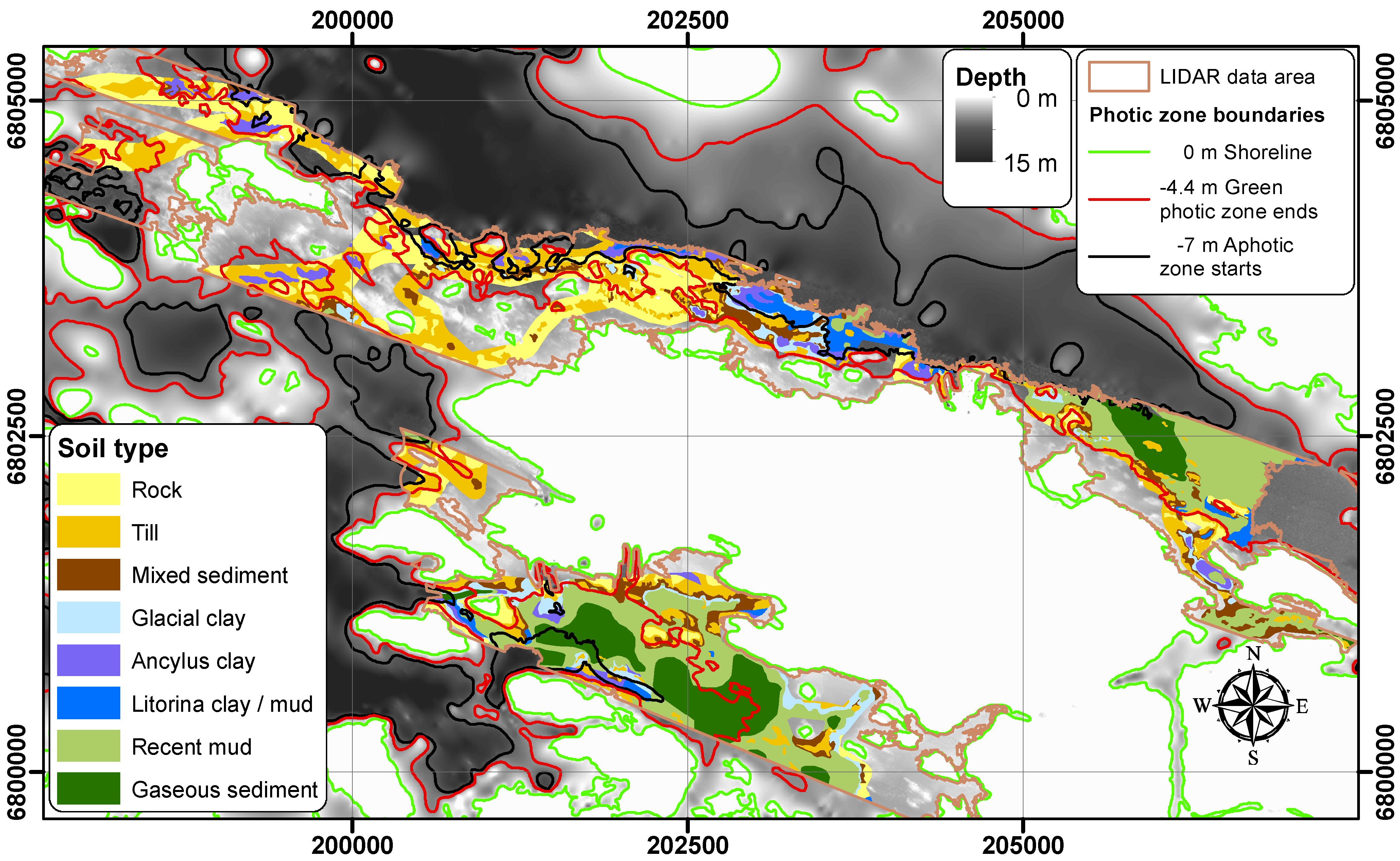 11]. The map is recompiled by the authors using the ArcGIS software. The photic zones are also indicated on the map. (The data used in this figure was obtained from Posiva Oy with permission.)