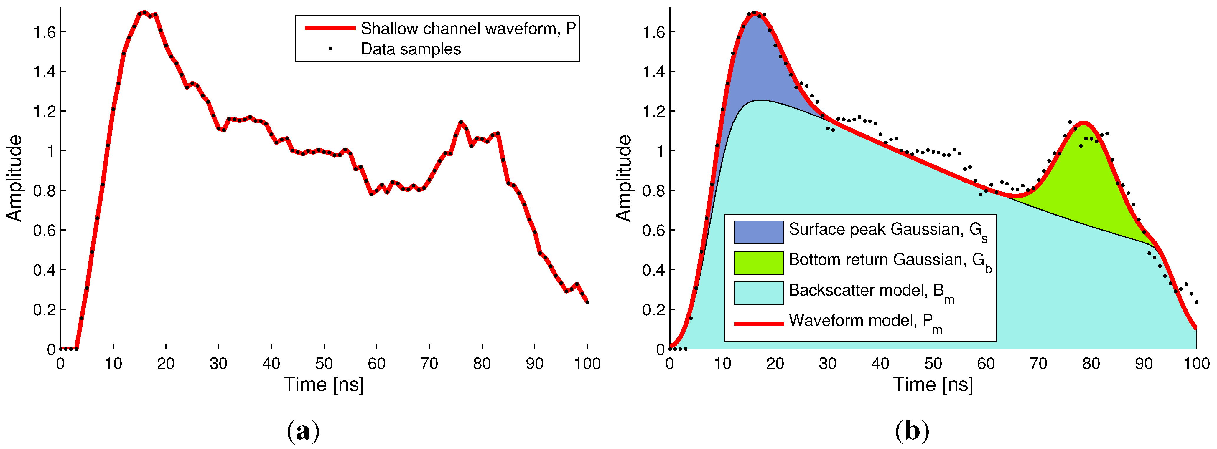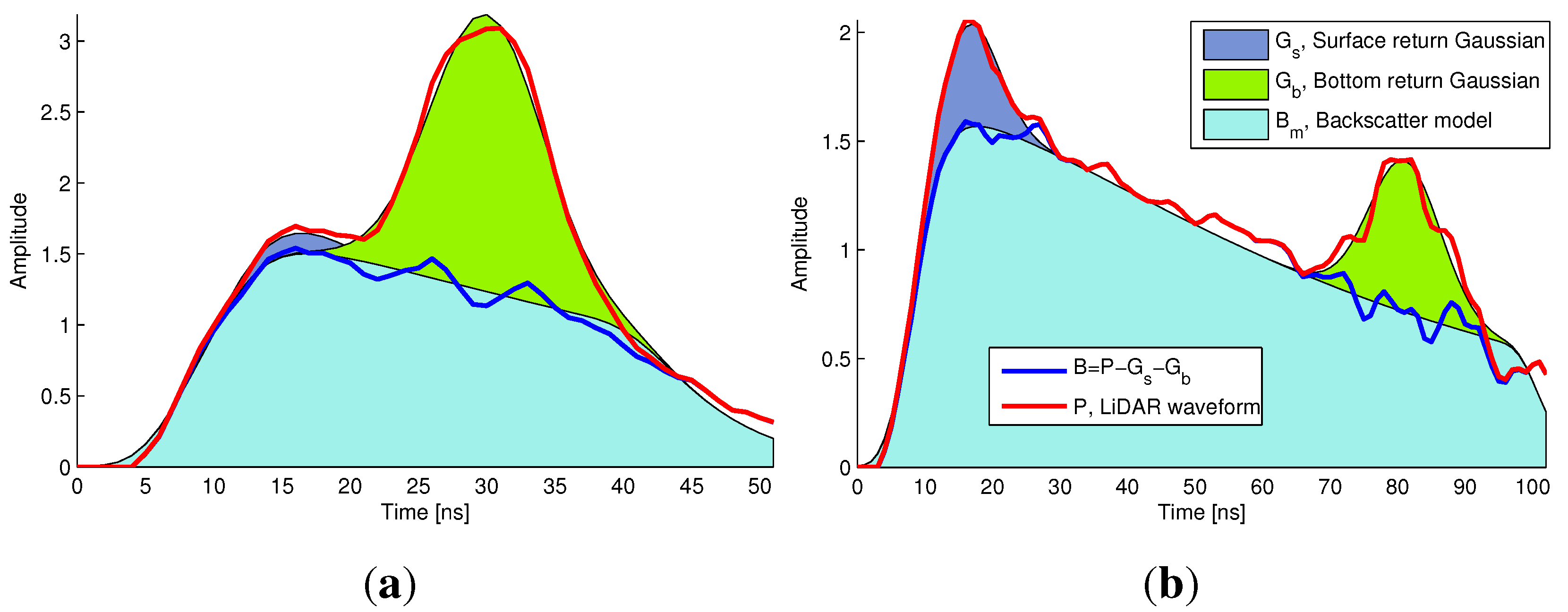 Figure 10b). In the case of shallow waters, the three waveform components are highly overlapping. Separation of the components would not be possible without additional information contained in the optimization constraints. The minimum depth from which the presented modeling method is able to reliably extract data is about 1 m. However, in shallow areas, the probability of modeling errors starts to increase. Modeling errors were dealt with by the outlier removal step of the algorithm (see