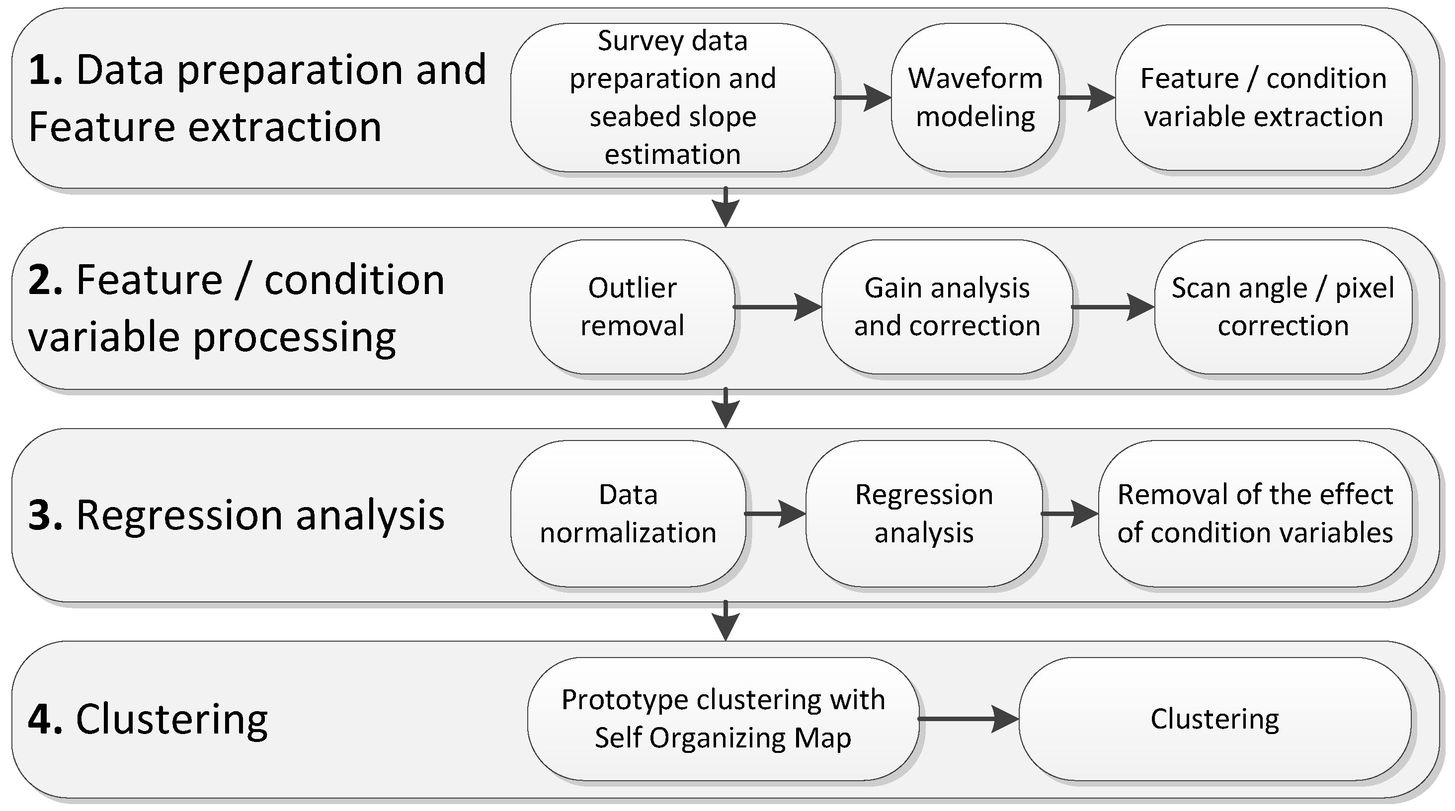 The study has several distinguishing features compared to the studies cited above. In benthic cover type classification, we rely on the return pulse waveform not using any information about the texture or shape of the sea bottom (except the allowance for seabed slope). Instead of finding a one-to-one relationship between predefined benthic classes and the output of the classifier, we rather cluster the return pulse waveforms according to their properties. The method is data driven in the sense that no physical model on the propagation of the LiDAR pulse in the environment is assumed and no ground truth training data are used to train the classifier. The variables used to correct for the environmental conditions are mostly derived from the waveform data themselves. The presented methodology is intended for initial analysis of the data acquired from large shallow sea areas in order to define regions where further field studies are necessary.