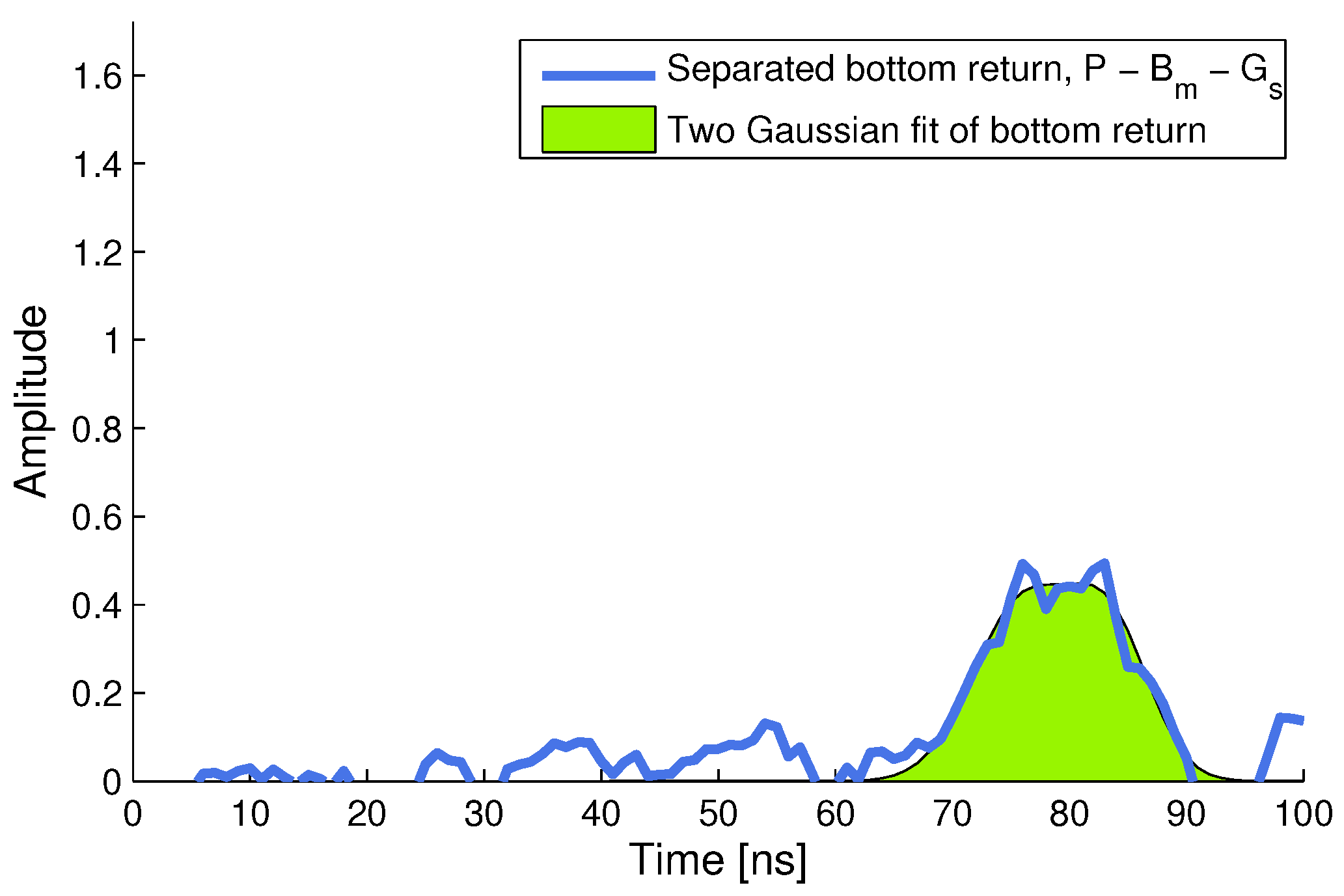 Separation of the backscatter, surface return and bottom return components of the waveform was accomplished using a constrained optimization algorithm to fit two Gaussian pulses