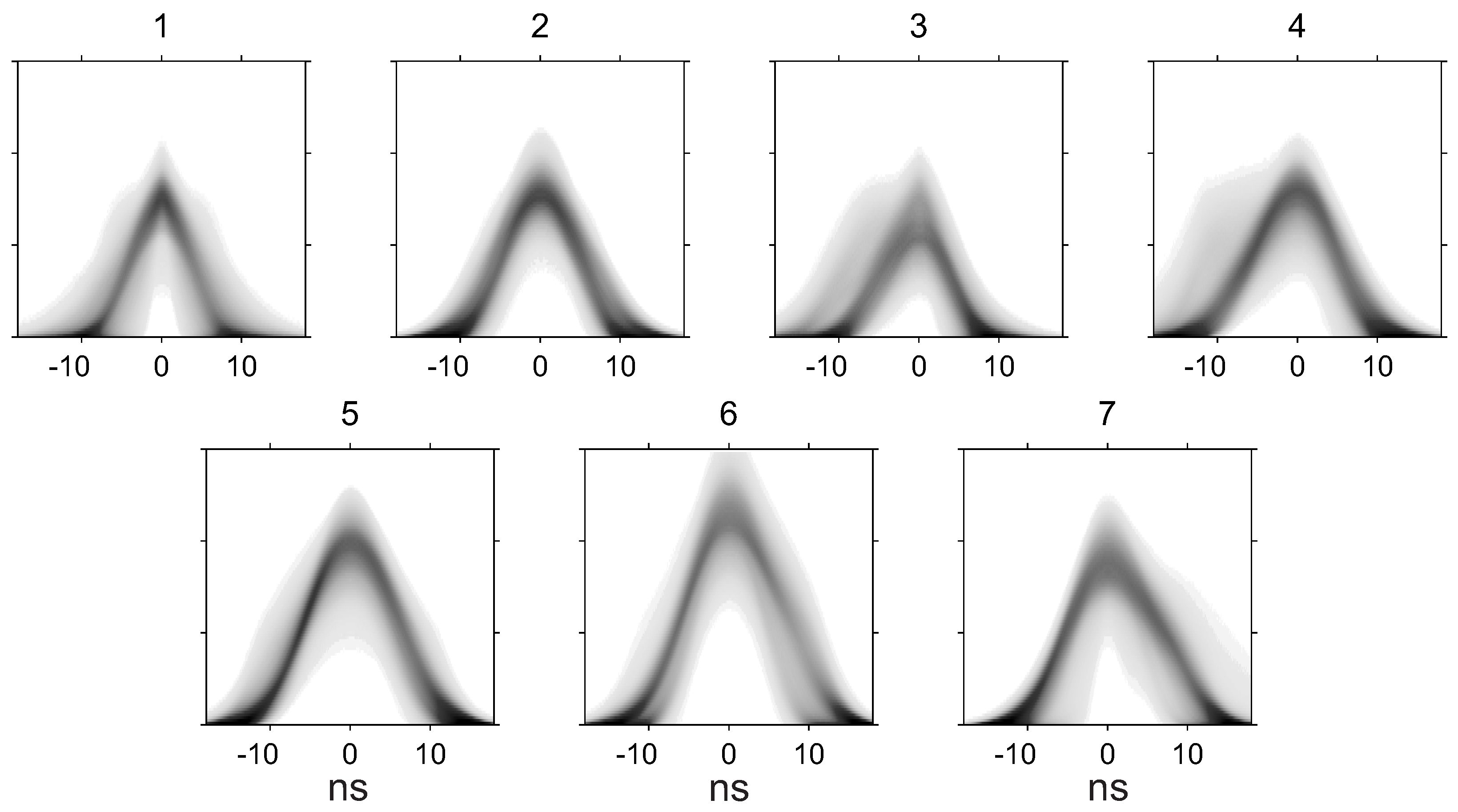 Bottom return pulse shapes and their distributions for the seven clusters.