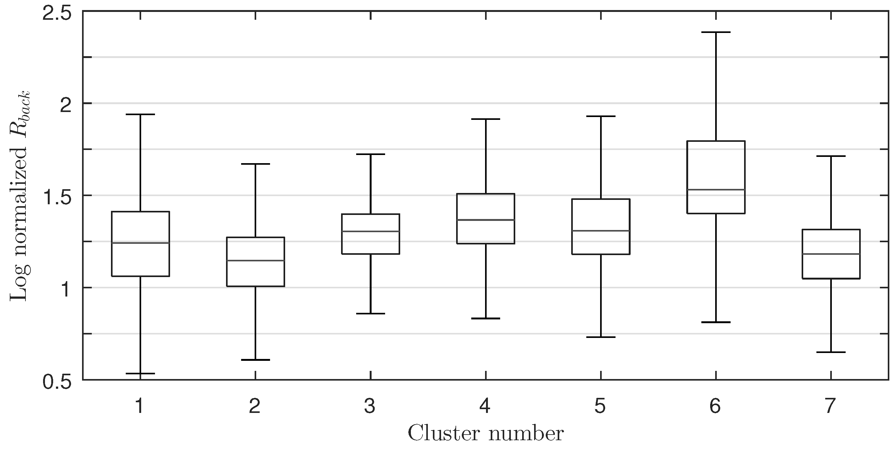 Figure 8, as this variable describes the backscatter and not the pulse waveforms. The clusters clearly differ from one another with respect to the feature variables listed in