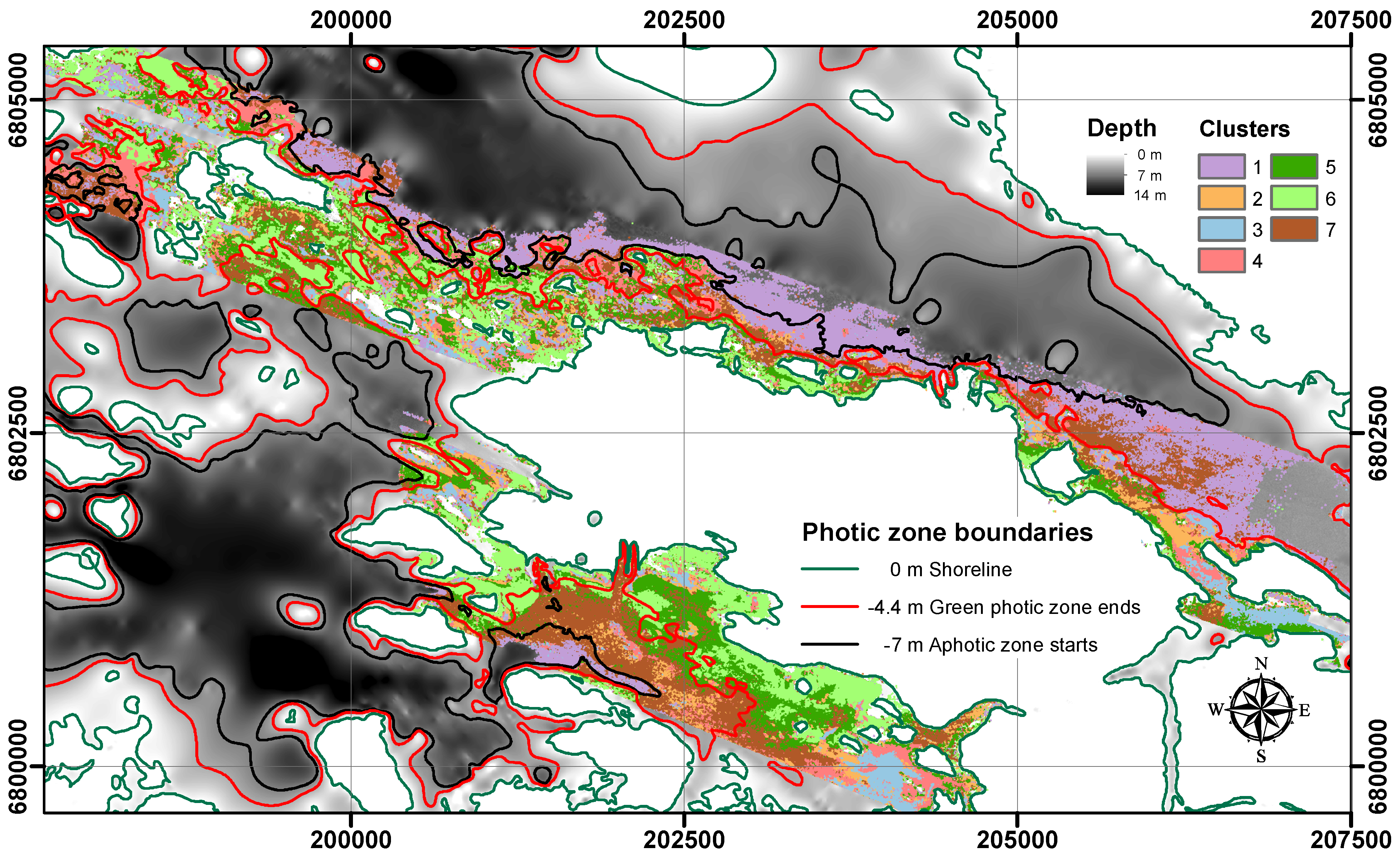 -m raster where the cluster of each pixel was determined as the mode of the cluster values of the data points inside a circle of 8-m radius around the center of the pixel. For visual clarity, a 3 × 3 cross-shaped mode filter was applied to the raster. By following the photic zone borders, it can be seen that they coincide relatively well with cluster boundaries, indicating a change in bottom return pulse properties.
