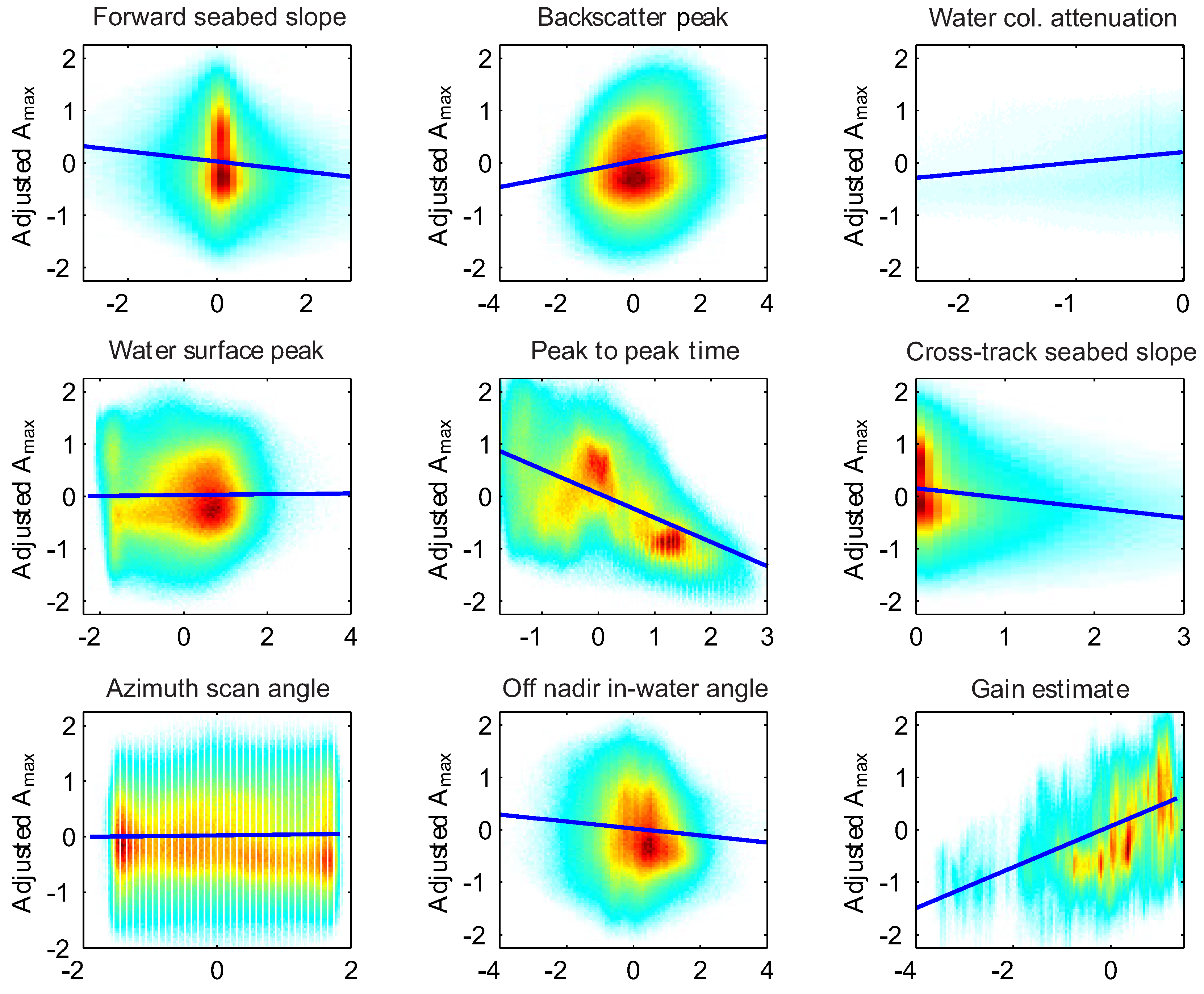 feature can be seen in the panels of the figure. Note that the cross-track slope of the seabed is assessed as deviation from the flat surface, and therefore, the distribution is one-sided. The distribution of the estimated water column attenuation has a long and narrow tail, indicating that the data contain some points from significantly more turbid water than most of the data. Only first order models were used in this study, as reliable fitting of the higher order terms was not plausible due to the uneven distribution of features with respect to variations in depth. The use of a higher order model could yield better correction for the particular condition variable, but is more sensitive to fitting errors and requires a significant amount of data from the whole range of the corresponding variables.