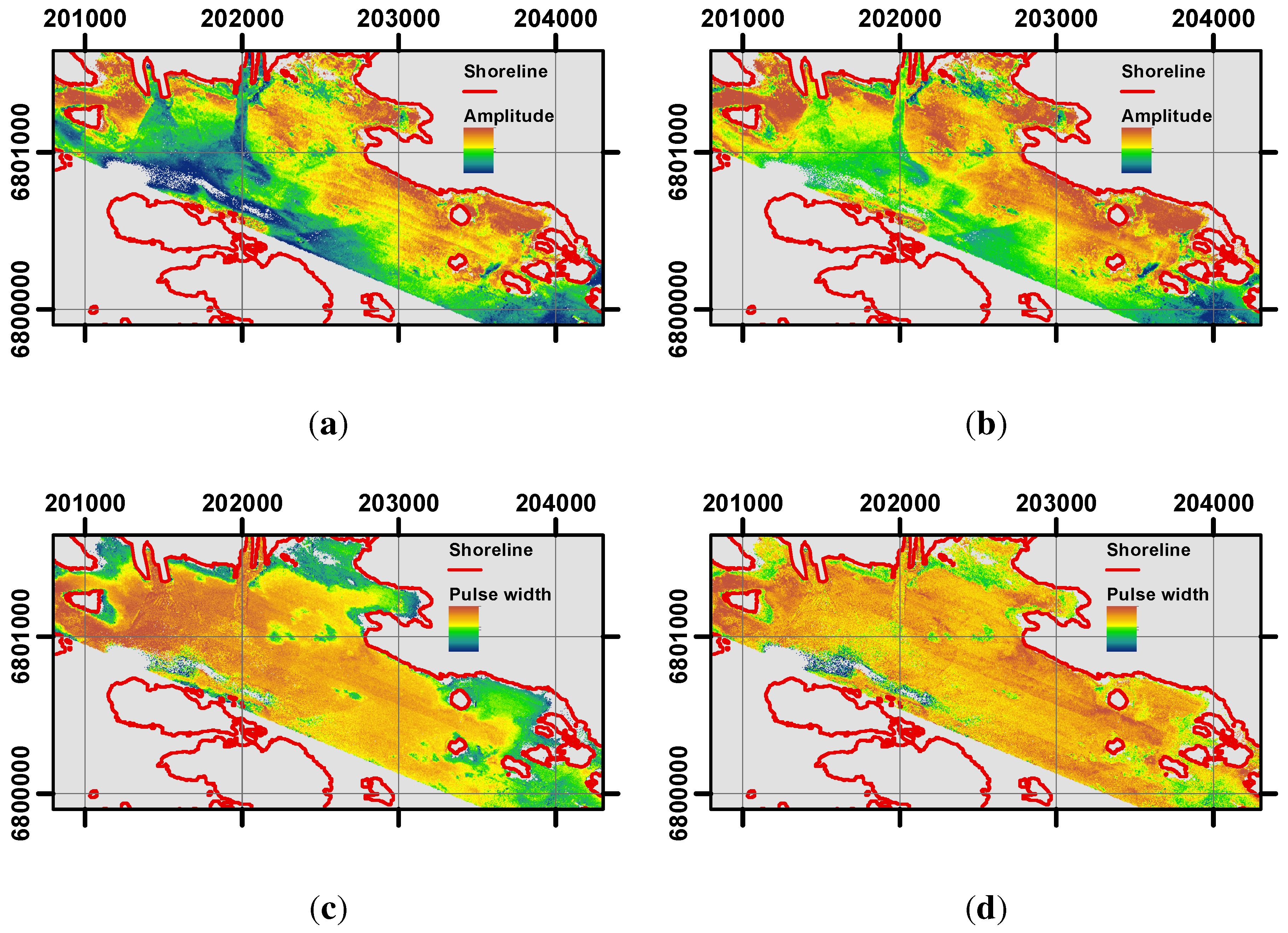 9], concentrate on the effect of environmental factors, such as surface waves or bottom slope on the within-flight line and between-flight line variability of the shape and amplitude of the LiDAR waveform. Wang and Philpot [