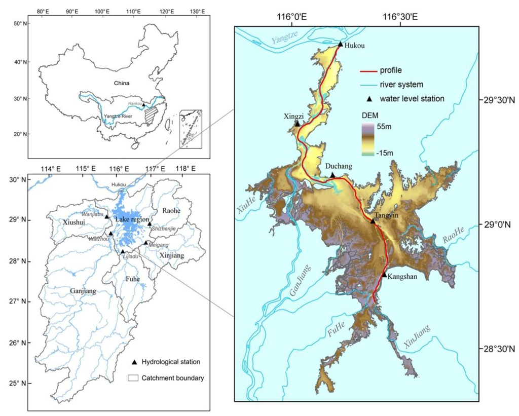 Poyang Lake is one of the most internationally important wetlands in terms of the provision of habitats for migratory birds [35]. In recent years, however, Poyang Lake has undergone remarkable declines in lake size. The changes have greatly affected the spatial availability of freshwater resources, resulting in significant hydrological, biological, ecological and economic consequences in the region [36,37,38]. These changes are receiving increasing international attention. For this reason, effective management of water levels for flood/drought prevention, water quality and water safety purposes have become a priority in Poyang Lake. Water level variations and surface gradients in the lake are critical to understand the hydraulic behavior of the large wetland systems [39] and very important for lake ecological conservation and water resource management and utilization [40,41]. However, like many large lakes, the water level gauge stations in Poyang Lake are sparsely distributed, resulting in poor spatial water level data for the large lake [42].