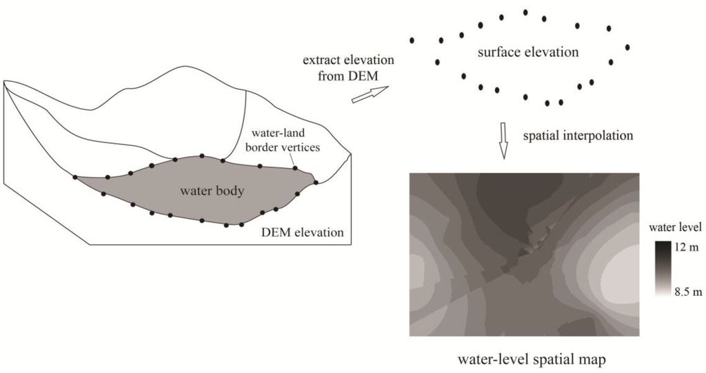 There are several accepted methods for retrieving water levels using various remote sensing data, each of which has its strengths and weaknesses. Radar altimetry is a promising technique for directly detecting water level [14,15,16], but the application of this technique to monitor inland waters has several limitations [17,18]. For one thing, it is difficult to analyze altimetry waveforms over a complex, varying surface [19,20]. For another, altimetry is a profiling technique, not an imaging technique; it can only provide a limited footprint of a lake and is unable to depict overall spatial distribution on a regional scale [21,22]. Moreover, there is an indirect method that uses the water level/area relationship to estimate the water level [23,24]. However, the derived relationships between water level and area are essentially empirical, and the transferability from one hydro-geomorphological setting to another has not been proven. More recently, several studies have used space-borne radar interferometry to detect water level variations over large lakes, rivers and floodplains [25,26,27,28]. This technique provides a measure of relative but not absolute changes in water level [29]. Although the upcoming Surface Water and Ocean Topography (SWOT) mission will be able to provide surface elevation data at a high spatial resolution [9,30], the mission is still being planned.