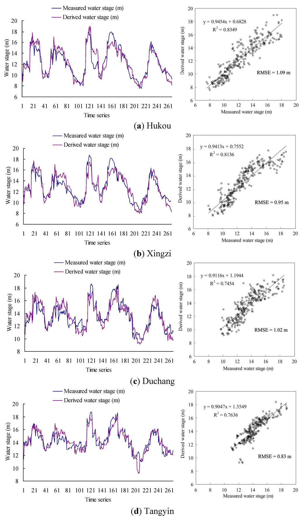 Comparison of derived water level and gauge-observed values at (a) Hukou station, (b) Xingzi station, (c) Duchang station, (d) Tangyin station, and (e) Kangshan station. The number of measurements N is 268.