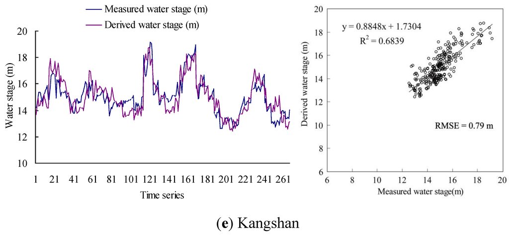 For satellite-derived water levels at all the gauging stations, comparisons with in situ measurements are shown in Figure 3. The derived results were highly correlated with the in situ measurements at Hukou, Xingzi and Duchang stations, which are located at the north of the lake. The root RMSE and MABE values were 1.09 m and 0.83 m for Hukou, 0.95 m and 0.86 m for Xingzi, and 1.02 m and 0.84 m for Duchang, respectively. The R2 values were relatively lower for Tangyin (R2 = 0.764) and Kangshan (R2 = 0.684). The corresponding RMSE and MABE values were 0.83 m and 0.63m for Tangyin and 0.79 m and 0.65 m for Kangshan, respectively.