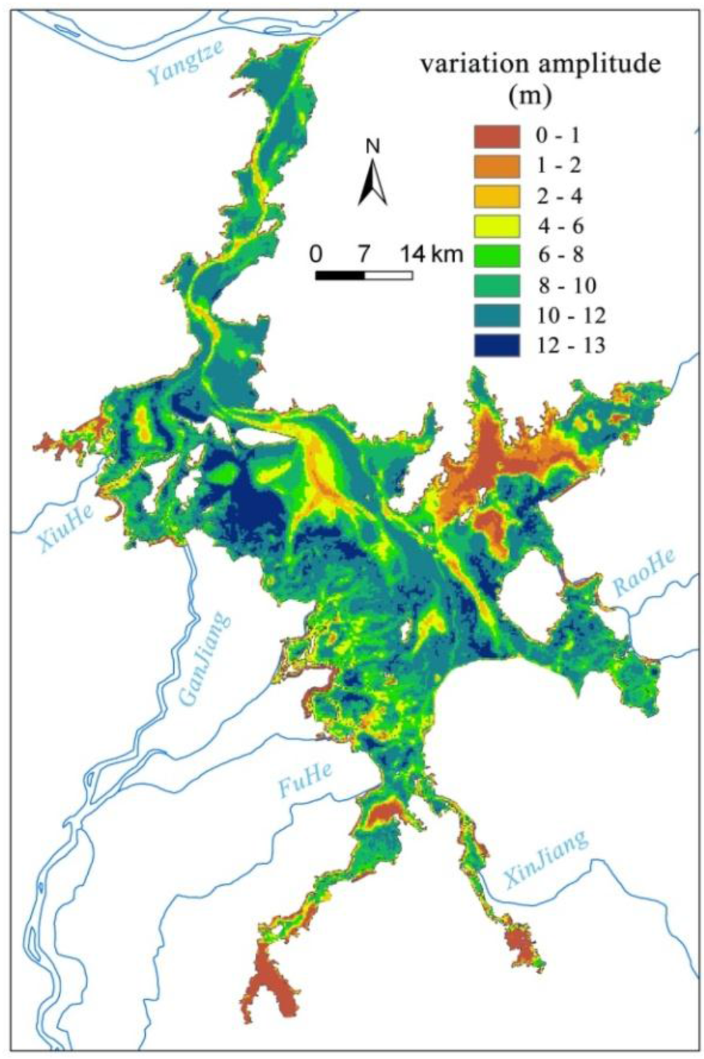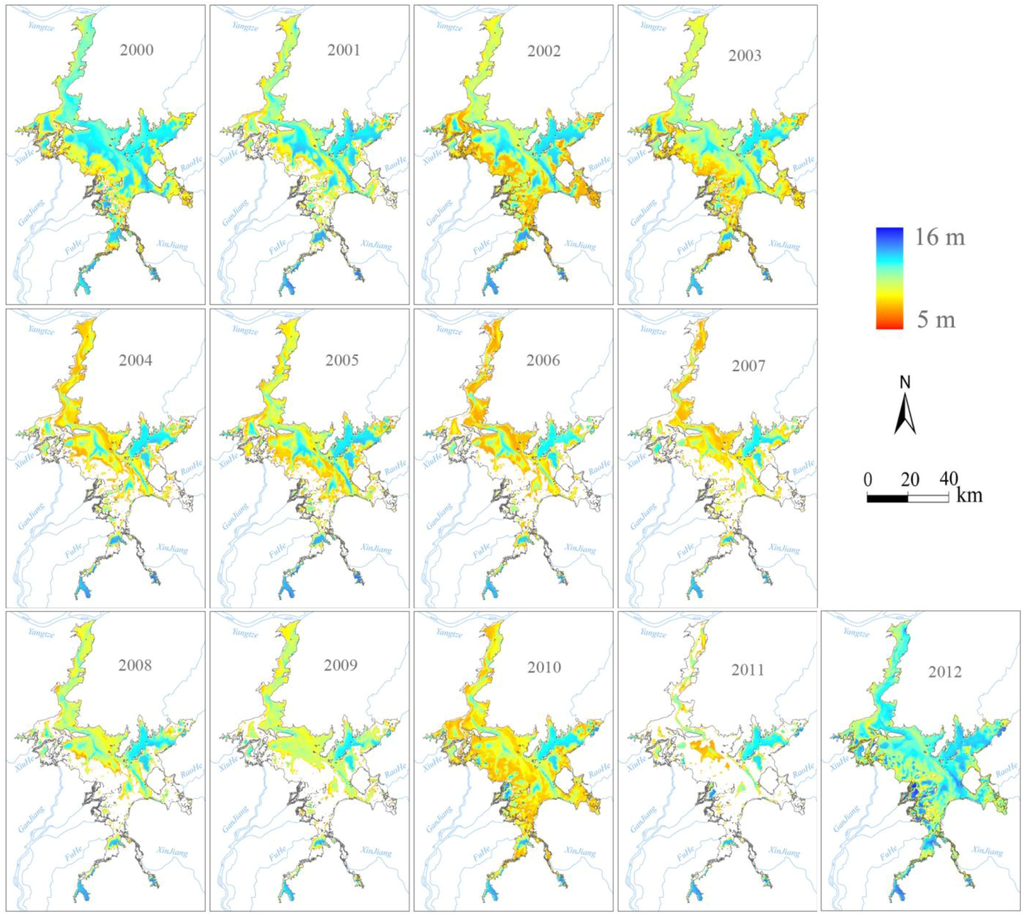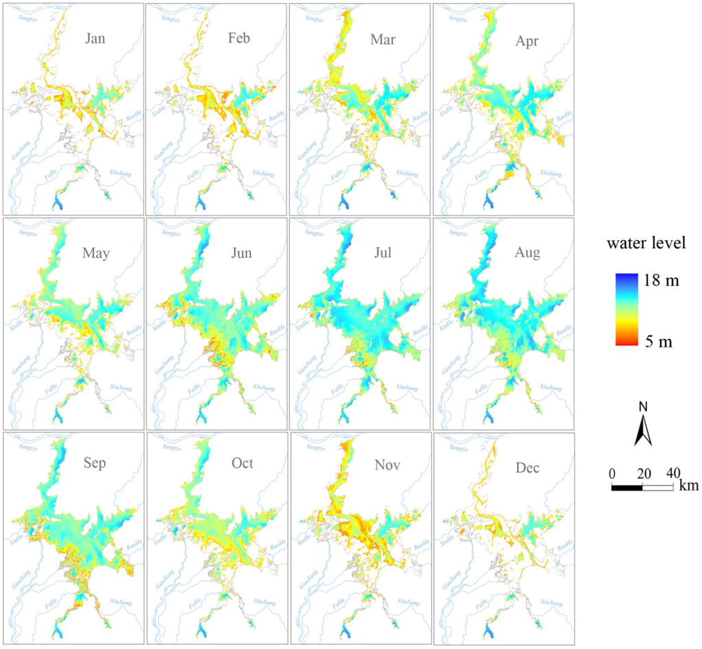 In addition, spatiotemporal changes within the lake were investigated using derived water levels. Temporally, water levels increased over 50% from low-water period to the high-water period across the entire lake region. Spatially, the variation amplitude of water level was relatively low in the inlets of the five tributary rivers throughout year. In contrast, the variation amplitude was relatively high along the main channel of the lake. On both sides of the lake channel, the variation amplitude was between 6 and 8 m, with higher values occurring in the north. The variation amplitude exhibited the highest values in the estuary delta zones. At the inter-annual scale, the water levels were high and remained relatively stable before 2003. From 2003–2011, lake water levels were significantly depressed. This decrease was most striking in 2011, suggesting that the lake experienced a severe drought in 2011.