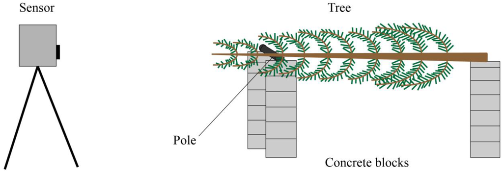 The trees were measured in a laboratory under environmentally stable conditions with eight spectral channels (554.8, 623.5, 691.1, 725.5, 760.3, 795.0, 899.0 and 1000.4 nm, and full width at half maximum of 17–19 nm) from a 3-meter distance from the top of the tree (Figure 1). The diameter of the laser beam was about 4 mm at target, and divergence was 0.02°. The trees were positioned horizontally with the base of the tree on a concrete block and a plastic pole supporting the tree trunk so that the top of the canopy was pointing toward the scanner, simulating an airborne data acquisition, and each tree was measured separately (Figure 2). About 100,000 returns were recorded for each tree, depending on the tree size, with a maximum of two returns recorded for each pulse. The 3-D point clouds represent the whole trees, i.e., no effort was made to classify the data into branches and needles.