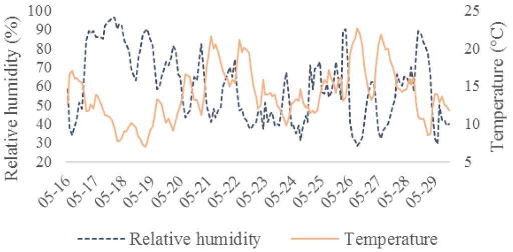 The trees, which were 3–3.5 meters in height and 5–6 cm in diameter at breast height, were cut and harvested 1–2 days before the measurements. The set of nine pine and nine spruce trees was first measured on 16 May 2012, and then again on 29 May 2012. As net photosynthesis and stomatal conductance is generally reduced after 2–3 days of drought [], a drought treatment was conducted by leaving the harvested trees outdoors to lean against a wall in an upright position for 12 days with their bases lying on grass surface. The trees are referred to as “fresh trees” before the drought treatment and as “dry trees” after the treatment in the following text. Mean temperature during the treatment was 14 °C, and mean relative humidity was 59% (Figure 3). No measurements of leaf water content or water potential were conducted. The data were processed with Gaussian pulse fitting and calibrated to the backscattered reflectance factor using a reference target [].