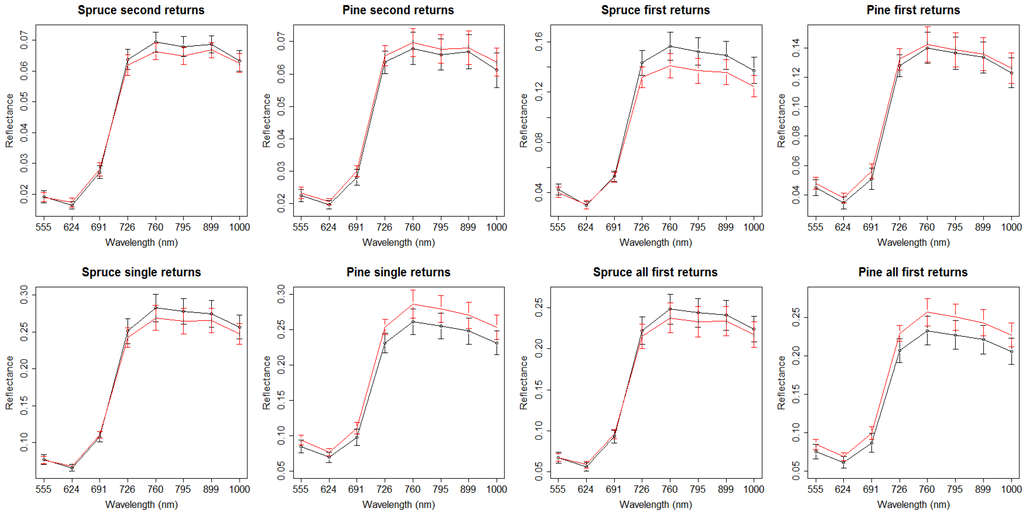Means of reflectance for the return types and their standard deviations (vertical bars) for each spectral channel. Black lines represent fresh trees, and red lines represent dry trees (drought induced trees).