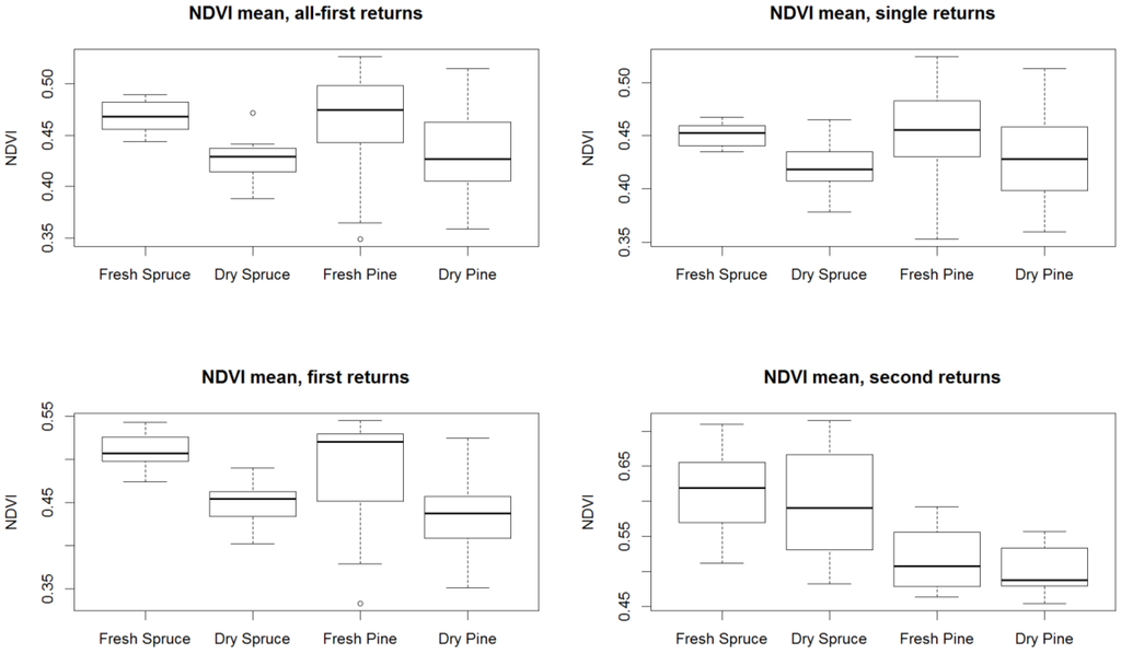 The NDVI was significantly lower after the drought treatment for both species in all return types except second returns. The NDVI was able to discriminate the dry spruces with all-first, first and single returns, although the reflectance of NIR bands was not significantly altered after the treatment in all-first and single returns. Although the direction of change in reflectance was opposite for the two species, the NDVI performed consistently and seems to not be sensitive to the direction of change in reflectance. The NDVI from multispectral Lidar has shown its potential before by explaining 82% of the variation in foliage nitrogen uptake with seven vegetation species []. However, it is unclear how much returns from woody material with varying NDVI values influenced the results. Generally, bark has low NDVI value, but it can be quite variable due to the presence of lichen and moss []. Separating returns between leaves and woody material may be possible if the difference in NDVI is clearly distinguishable [].