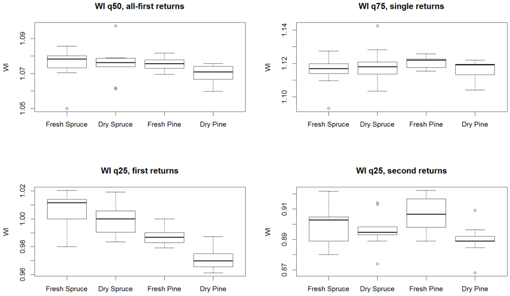The WI mean showed a statistically significant decrease (p < 0.05) for pines, following the drought treatment, for all-first returns (Figure 6). For pine, quantile 25 of the WI showed a statistically significant decrease for first and second returns, quantile 50 for all return types, quantile 75 for single and all-first returns, and quantile 100 for second returns, respectively. This indicates that the distribution of WI values was altered after the drought treatment, especially between quantiles 25 and 75 of the data, although mean differences were detected only with all-first returns. Spruces did not show the same variation in WI, and no statistically significant changes were detected following the drought treatment.