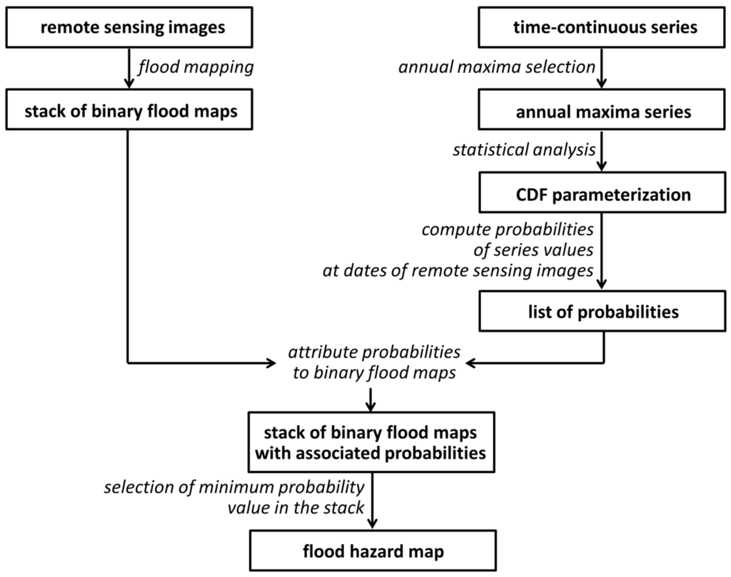 A flood hazard mapping approach purely based on satellite observations would be welcome by the scientific community, as it would have the merit of being accurate, robust, and applicable throughout the world, particularly in regions where ground observations are not available. However, this approach is currently limited by the fact that collected time series of images are discontinuous and that the time periods covered are not long enough to provide an estimate of flood inundation probability distributions.