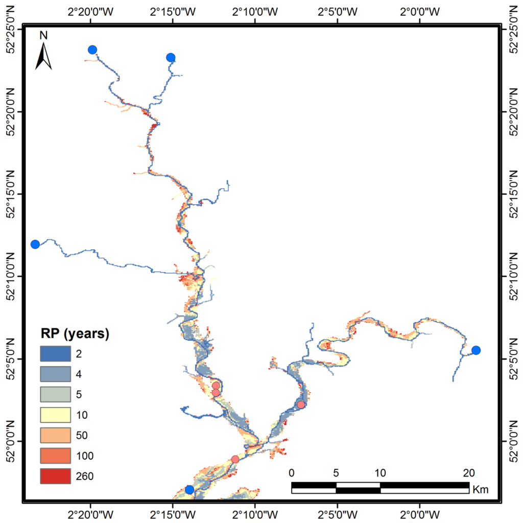 The AOI of our study covers an extent of [51.9, 52.4] degrees of latitude and [−2.4, −1.9] degrees of longitude, as displayed in Figure 2. It has been chosen for two main reasons: (i) it covers an alluvial plain that is frequently affected by floods in the region, and (ii) a LISFLOOD-FP hydraulic model is available together with long records of in situ measured river discharge. The latter can be used to compute a reference hazard map with a traditional approach based on numerical modeling. This region is a data-rich environment, where model inputs, i.e. peak discharges of selected RPs, can be derived from statistical analysis of long discharge records.