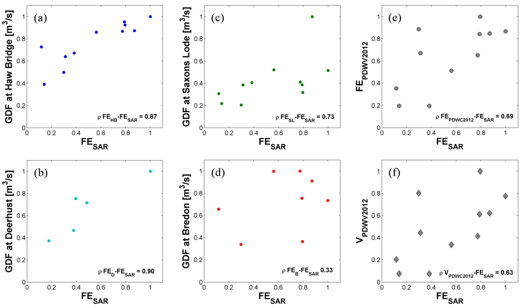 As the information provided by PDWC2012 is available on a daily basis (attributed at midday of each day), for those days with more than one SAR observation, we selected only the map whose time of acquisition is closer to midday. In conclusion, out of the 19 images of floods, we eventually retained 12 images, for a total number of 12 days where inundation was observed and FESAR was computed. They include the 2007 summer flood, one of the highest events observed by satellite on the Severn.