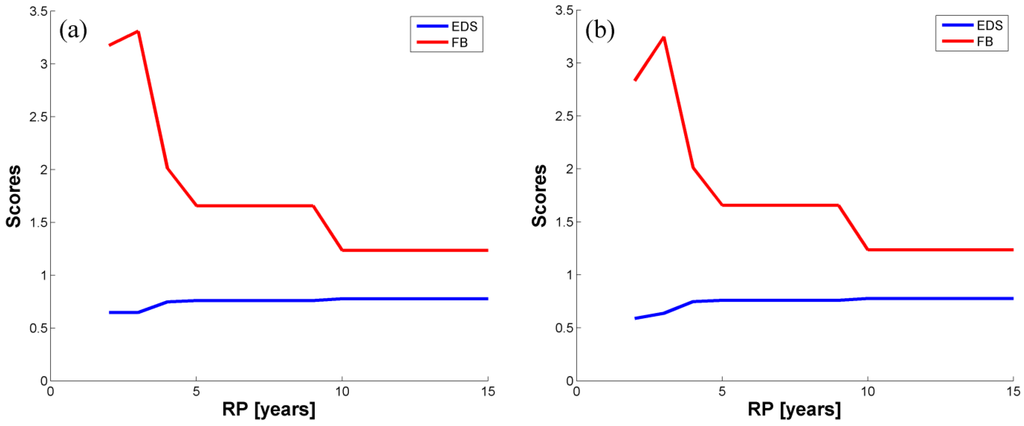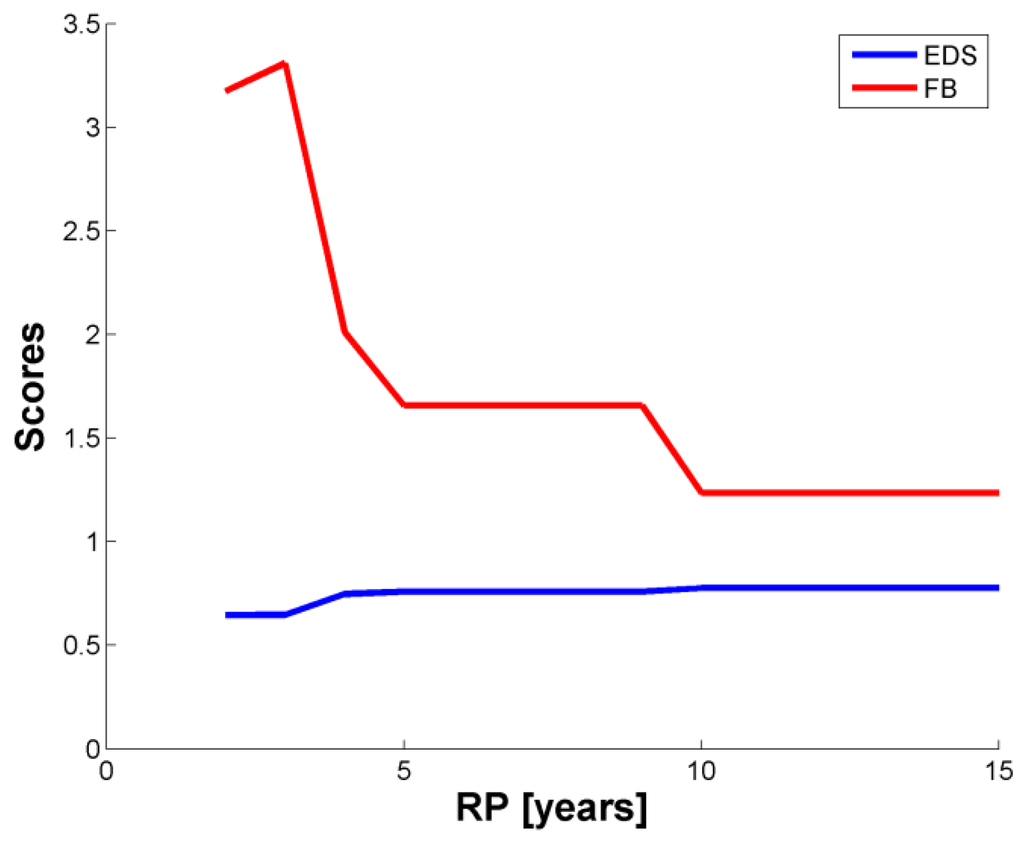 The analysis has then been extended by considering HMFE as map to be evaluated and assuming HMGDF to be the reference map (see Table 2). The skill scores of Figure 10 confirm the similarity between the maps, as expected from the results shown in Figure 8. In particular, EDS has a value close to its optimum: this indicates skill for all considered RPs and a trend that shows improvements with increasing RPs. FB indicates a slight overestimation of HMFE with respect to HMGDF.