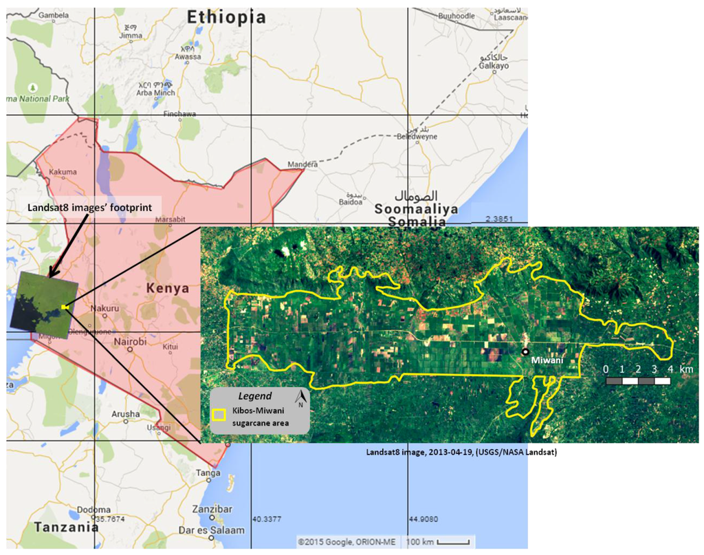 The study covers Kibos-Miwani sugarcane zone in Kenya (Figure 1) at a local landscape scale within a space of 104 km2 and located between 34.8°E to 35.08°E and 0.01°S to 0.11°S. The area has an altitude of 1000 m above sea level, receiving rainfall of between 1400 mm and 1550 mm and an average size of land measuring 3 hectares (ha). The main crop in the zone is sugarcane, besides maize and horticultural crops. Different sugarcane varieties are planted in the months of April and September congruent with the bimodal rainfall in March to June and September to December [9,25]. According to KESREF surveys of October 2013, harvesting of this crop is either by burning (over 70%) before cutting the stalks or by green harvest modes (cutting with trash). It is the diversified planting dates and different harvesting modes that provide an enabling environment to undertake mapping of cropping practices (crop type and harvest mode) in this zone.