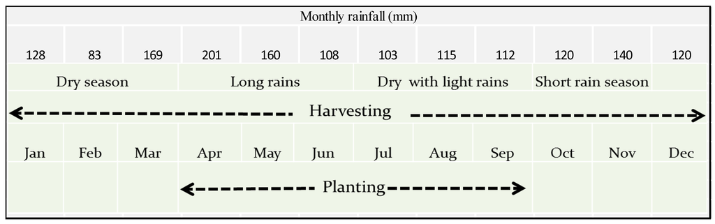 Figure 2 illustrates the monthly rainfall, cropping calendar and harvesting culture. Planting is undertaken between April and September due to the bimodal rainfall received in western Kenya [19], maturity lasts between 14 and 18 months, while harvesting is conducted throughout the year depending on rainfall, variety and crop cycle (plant crop (for first planted crop) or ratoon (regrowth after each harvest since sugarcane is a perennial crop)). It is observed that planting occurs during the month with increased rainfall.