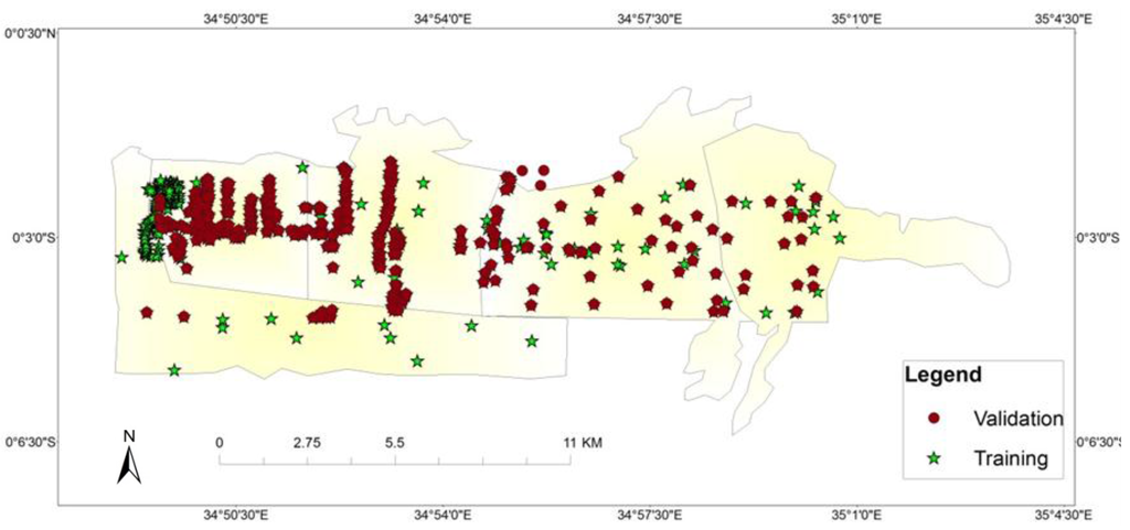 - The ground survey data were composed of 831 observations, where 530 fields were sugarcane and 301 fields were other land cover. These fields were encoded during a ground survey conducted between 14 and 18 October 2013. Figure 3 illustrates the location of the surveyed fields in Kibos-Miwani zone, showing location of those used for training (75%) and those used for validation (25%).