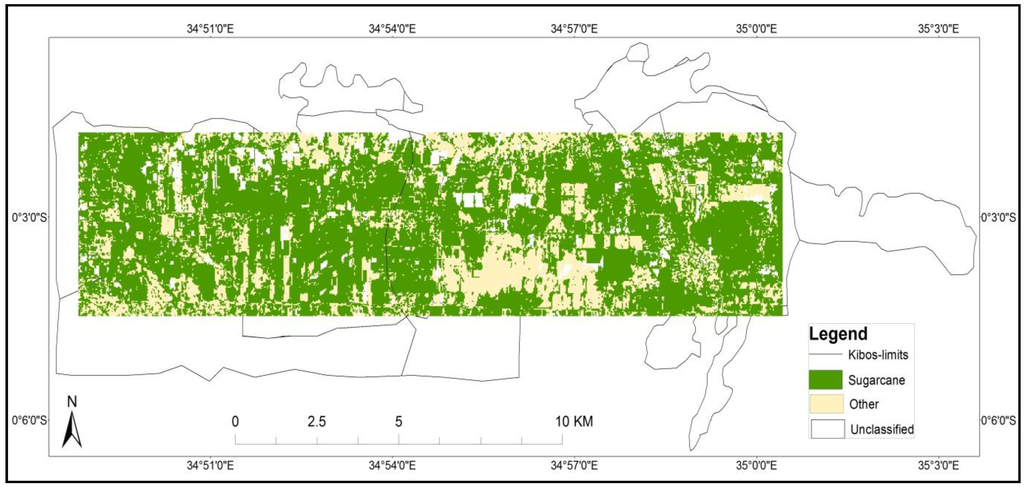The spatial heterogeneity between sugarcane fields in Figure 6 is assumed to imply that crop management such as planting date, weed control, harvesting mode are the drivers of these local variations [7,18]. Figure 7 shows the classified Landsat image of Kibos-Miwani after post classification. The figure illustrates two classes, sugarcane and other, and shows that over 85% of the landscape is under sugarcane.