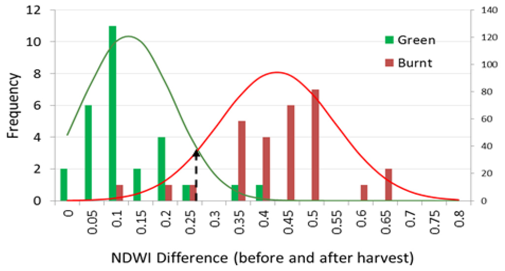 Inferring that NDWI is a good indicator for harvest mode, we draw the frequency in value occurrence for differences in NDWI before and after harvest (NDWI_Diff), for green and burnt (Figure 9). The NDWI_Diff frequency of occurrence shows that at harvest, approximately 90% of the green harvested fields have NDWI_Diff below 0.27 while approximately 90% of the burnt harvested fields have NDWI above 0.27. We infer that NDWI_Diff value of 0.27 is a threshold for separating the burnt and green harvest classes.