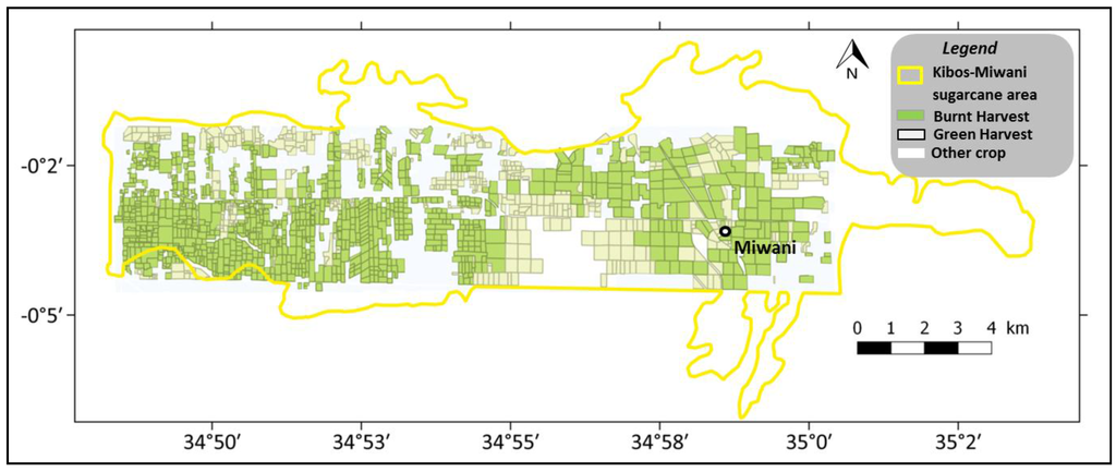Table 5 shows the fraction area covered by each class. Area under green harvest mode accounts for 25% of the total area, while area under burnt harvest accounts for 75% of the total area. These results confirm ground information, where, burnt harvest is a dominant practice in Kibos-Miwani with 74.5% coverage compared to 25.5% for green harvest mode.