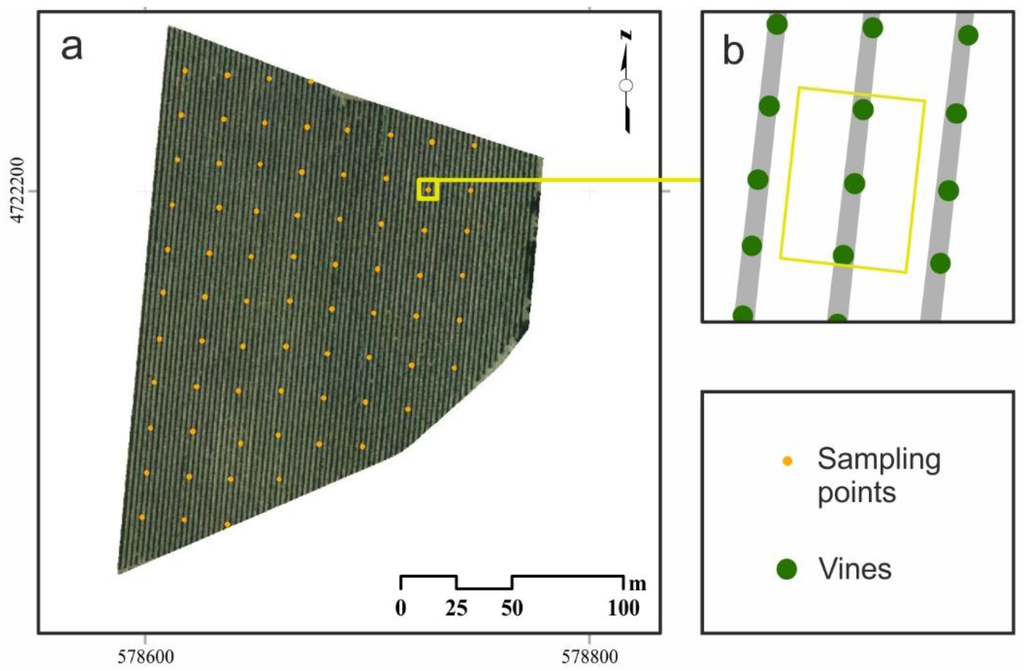 Experimental Tempranillo vineyard plot with the 72 sampling points (a). Schematic describing the position of the three adjacent vines comprising a sampling point (b).