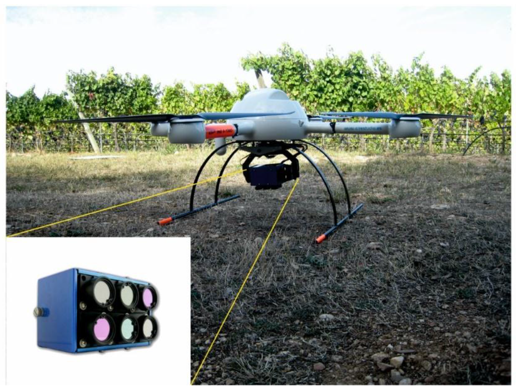 Multi-spectral imagery was acquired with a multi-spectral camera, a mini multiple camera array (MCA 6, Tetracam Inc, Chatsworth, CA, USA) mounted on a RPAS Md4-1000 (Microdrones GmbH, Siegen, Germany) on 20 September 2011 (Figure 2). The RPAS Md4-1000 is a quadrotor able to carry 1.2 kg of payload mass and able to fly up to 88 minutes, with vertical take-off and landing. The camera consisted of six independent image sensors and optics with user-configurable filters. Image resolution was 1280 × 1024 pixels with 10-bit radiometric resolution and optics focal length of 9.6 mm. For this study, the camera was equipped with six 25 mm-diameter bandpass filters of 10 nm full-width at half-maximum (FWHM) (Andover Corporation, NH, U.S.), with centre wavelengths at 531, 551, 570, 672, 701, and 802 nm, and bandwidth of ±9.31, 10.13, 9.29, 9.82, 9.47, and 10.11 nm, respectively. The wavebands were selected in order to obtain the spectral bands required for the calculation of the spectral indices commonly used in agriculture, and, specifically, viticulture-related literature.