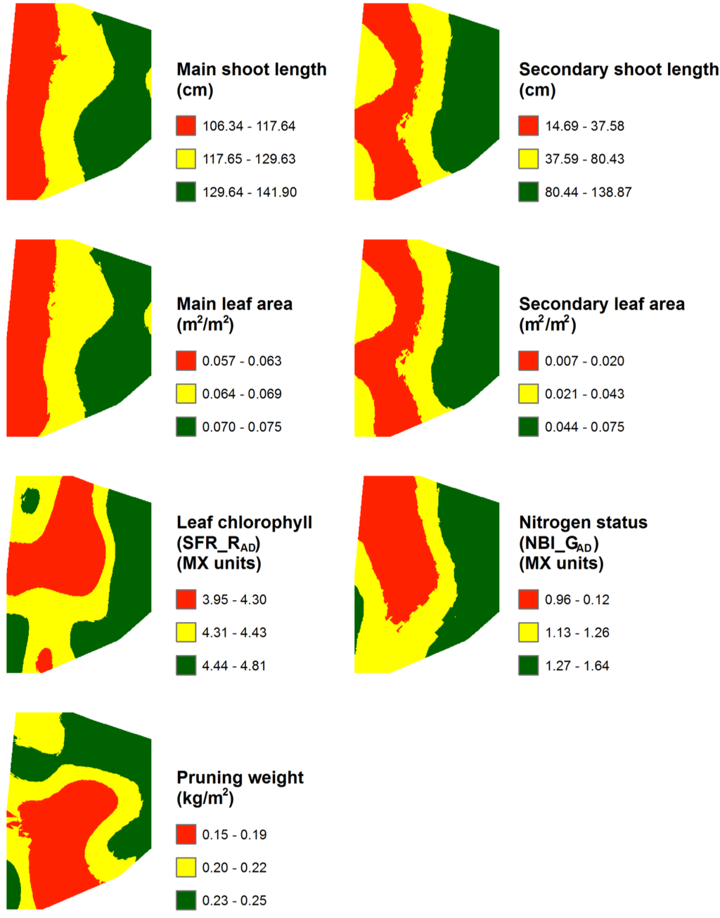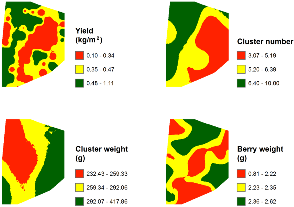 All of the experimental variograms of the variables studied were fitted to a Spherical or Gaussian model, with the exception of yield per vine and the anthocyanin concentration, which showed an absence of spatial structure as also found by Cerovic et al. [52]. The range of the variogram is the distance at which the sill (maximum semivariance) is achieved and indicates whether the samples are spatially dependent (samples separated by distances closer than the range) or spatially independent (samples separated by distances larger than the range) [53]. The range value was variable for all parameters studied (Table 2). Main leaf area, main shoot length, pH, and titratable acidity showed a range around 125 m. The spectral index, G, was the variable with the highest range value (202 m). The lowest values of the range (from 38 to 65 m), that is the lowest distance of spatial dependence, were found for the fluorescence index related to leaf chlorophyll content, the vegetative variable pruning weight, the two normalised spectral indices NVI1 and NVI2, for berry weight, and for total phenols. Specifically, the range obtained for the pruning weight agrees with the one reported by Taylor and Bates [54] for the case of 3-vines-aggregation. Furthermore, the nugget effect, which is the discontinuity at the origin of the variogram (unexplained variance) usually related to the variability at distances lower than the sampling grid, yielded, in general, values higher than 25% of the total variance. This indicates a moderate spatial dependence [55] with the exception of the normalized indices NVI1 and NVI2, with strong spatial dependence. The range and percentage of nugget for the main shoot length was similar to that obtained by Baluja et al. [47]. Cerovic et al. [52] also reported a similar value of percentage of nugget for the NBI_GAD and for cluster number per vine.
