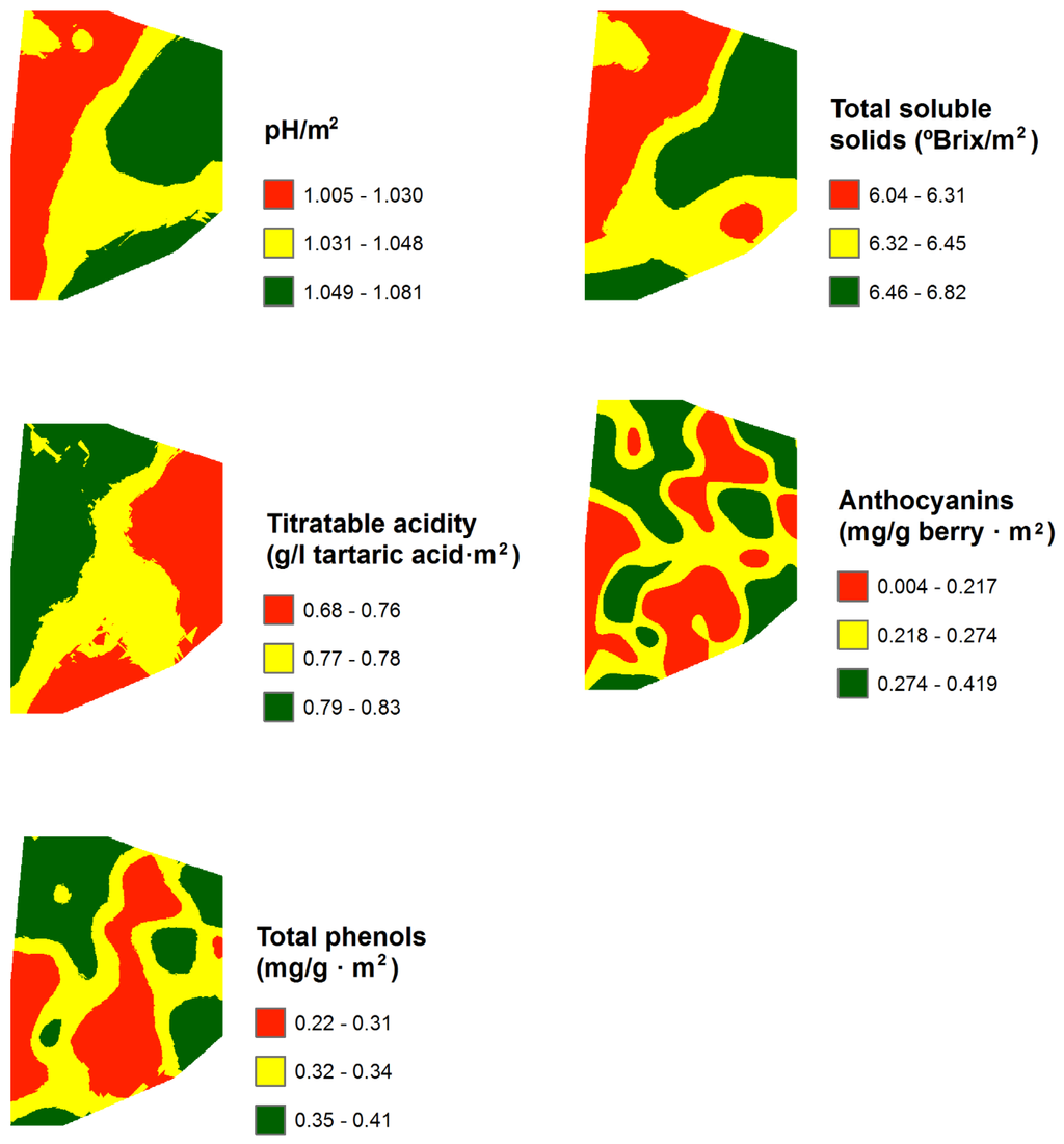 For all data collected in the field and relative to berry composition, the values of the three vines per sampling point were averaged and a mean value was then assigned to each sampling location. The vegetative variables, pruning weight, main leaf area and secondary leaf area, and the productive variable, yield, were transformed to surface units (per m2) by dividing them by the vine spacing [28].