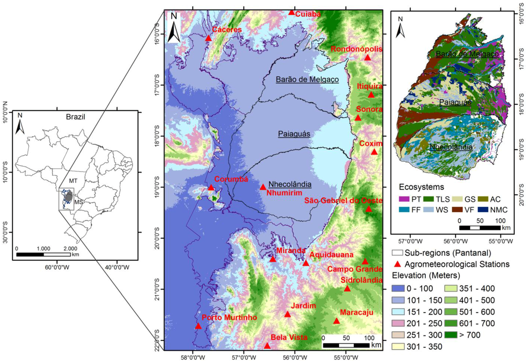 Figure 1 shows the location of the Pantanal in the Mato Grosso and Mato Grosso do Sul Brazilian states, the agro-meteorological stations used from the National Meteorological Institute (INMET) and the ecosystems inside the Barão de Melgaço (BR), Nhecolândia (NH) and Paiaguás (PA) sub-regions classifyed according to Embrapa Pantanal, SOS Pantanal Institute, WWF-Brazil [5].