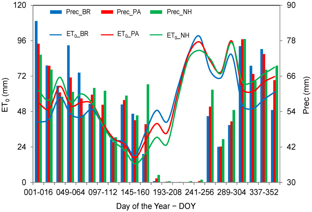 Weather conditions were first analyzed because they affect the radiation and energy balances. Figure 3 presents the trends for the totals of precipitation (Prec) and reference evapotranspiration (ET0) resulting from the interpolation processes. The values are pixel averages for the BR, PA and NH sub-regions during the year 2012, considering the composed 16-day period MODIS images, in terms of Day of the Year (DOY).