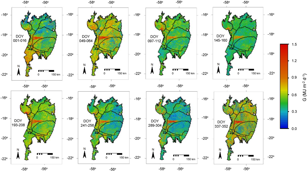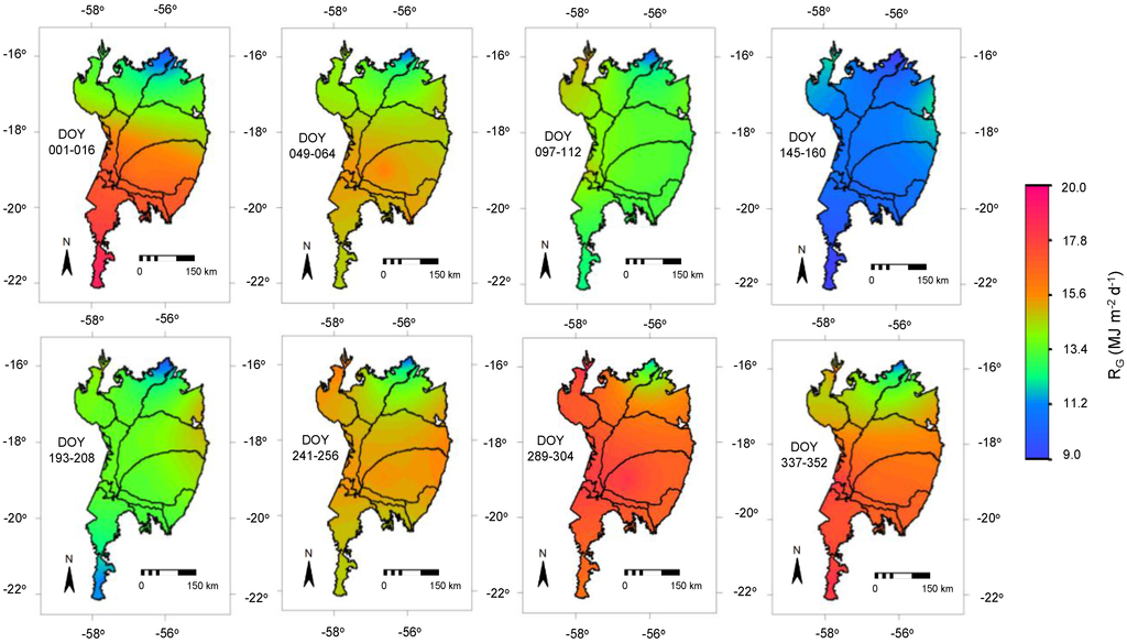 Figure 4 shows the spatial distribution of the incident global solar radiation (RG) daily averages for some the selected 16-day period MODIS images, during 2012, in terms of Day of the Year (DOY), in the Brazilian Pantanal.
