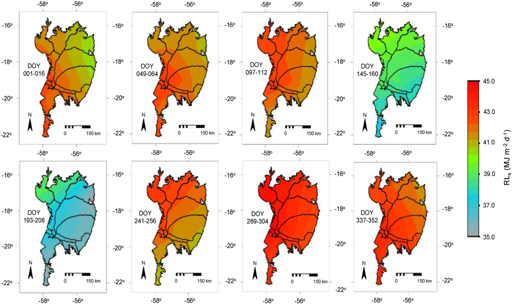 Figure 6 presents the spatial distribution of the emitted surface long-wave radiation (RLs) daily values, for the selected 16-day period MODIS images, in terms of Day of the Year (DOY), during 2012, in the Brazilian Pantanal.