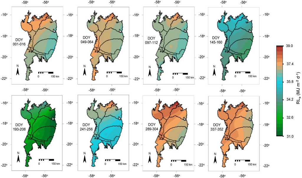 Figure 7 presents the spatial distribution of the emitted atmospheric long-wave radiation (RLa) daily values, for the selected 16-day period MODIS images, in terms of Day of the Year (DOY), during 2012, in the Brazilian Pantanal.