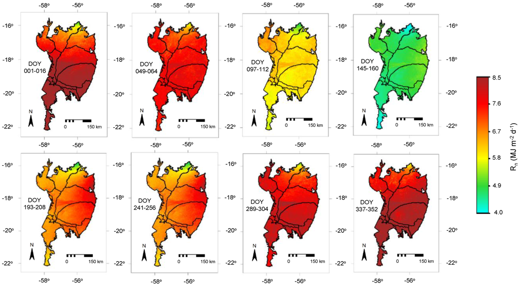 RG, considered the radiation (directly or indirectly) from the sun, integrated over all wavelengths in the shortwave interval, presented temporal and spatial variations. The highest pixel values occurred at the end of the year, after the second half of October (DOY 289–304), mainly in the Pantanal southeastern areas, while the smallest ones were during the period from May to June (DOY 145–160).
