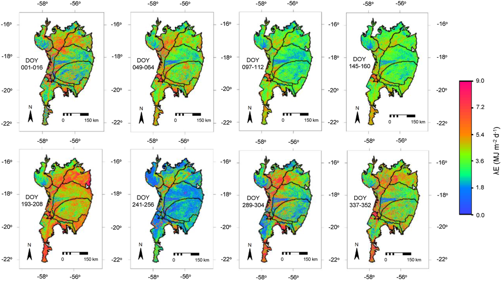 As 23 images are too many for showing each radiation and energy balance parameter in the paper, and considering that for the composed 16-day MODIS periods some of them are similar in terms of the thermohydrological and ecosystem conditions, we selected eight to represent the dynamic of the energy exchanges during the year 2012.