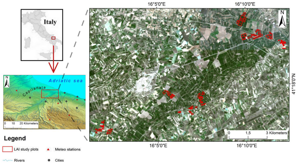 Study area location with overview of LAI plot measurements. Natural color composition of Landsat 8 image acquired on 26 August 2014.