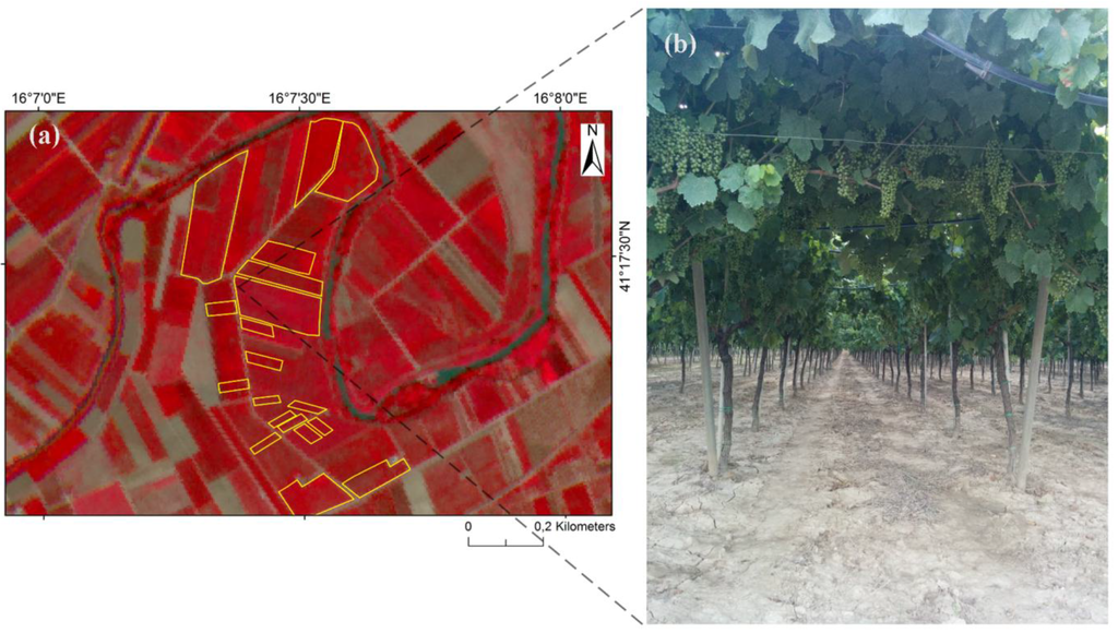 (a) Overall view of the vineyard study field displayed on a RapidEye image acquired on 2 August 2014 (infrared false color composition 532). Yellow borders show the experimental plots. (b) Canopy growth of the vineyard inter-row acquired on 24 July 2014.